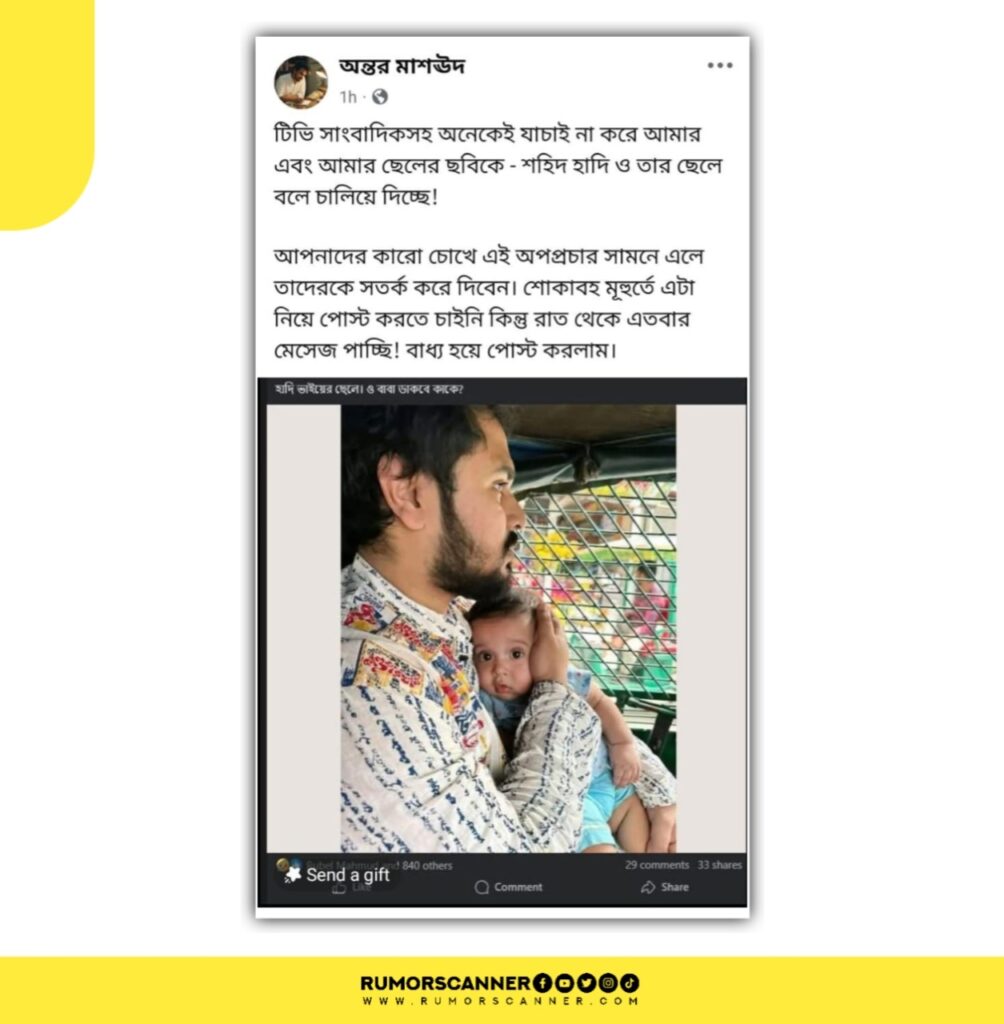 পাশাপাশি অনুসন্ধানে শিশুটির বাবা অন্তর মাশঊদের ফেসবুক অ্যাকাউন্ট পাওয়া যায়। অ্যাকাউন্টটিতে ১৯ ডিসেম্বর অন্তর মাশঊদ আলোচিত দাবিতে প্রচারিত একটি পোস্টের স্ক্রিনশট সংযুক্ত করে ছবিটির বিষয়ে লিখেছেন, ‘টিভি সাংবাদিকসহ অনেকেই যাচাই না করে আমার এবং আমার ছেলের ছবিকে – শহিদ হাদি ও তার ছেলে বলে চালিয়ে দিচ্ছে! আপনাদের কারো চোখে এই অপপ্রচার সামনে এলে তাদেরকে সতর্ক করে দিবেন। শোকাবহ মূহুর্তে এটা নিয়ে পোস্ট করতে চাইনি কিন্তু রাত থেকে এতবার মেসেজ পাচ্ছি! বাধ্য হয়ে পোস্ট করলাম।’