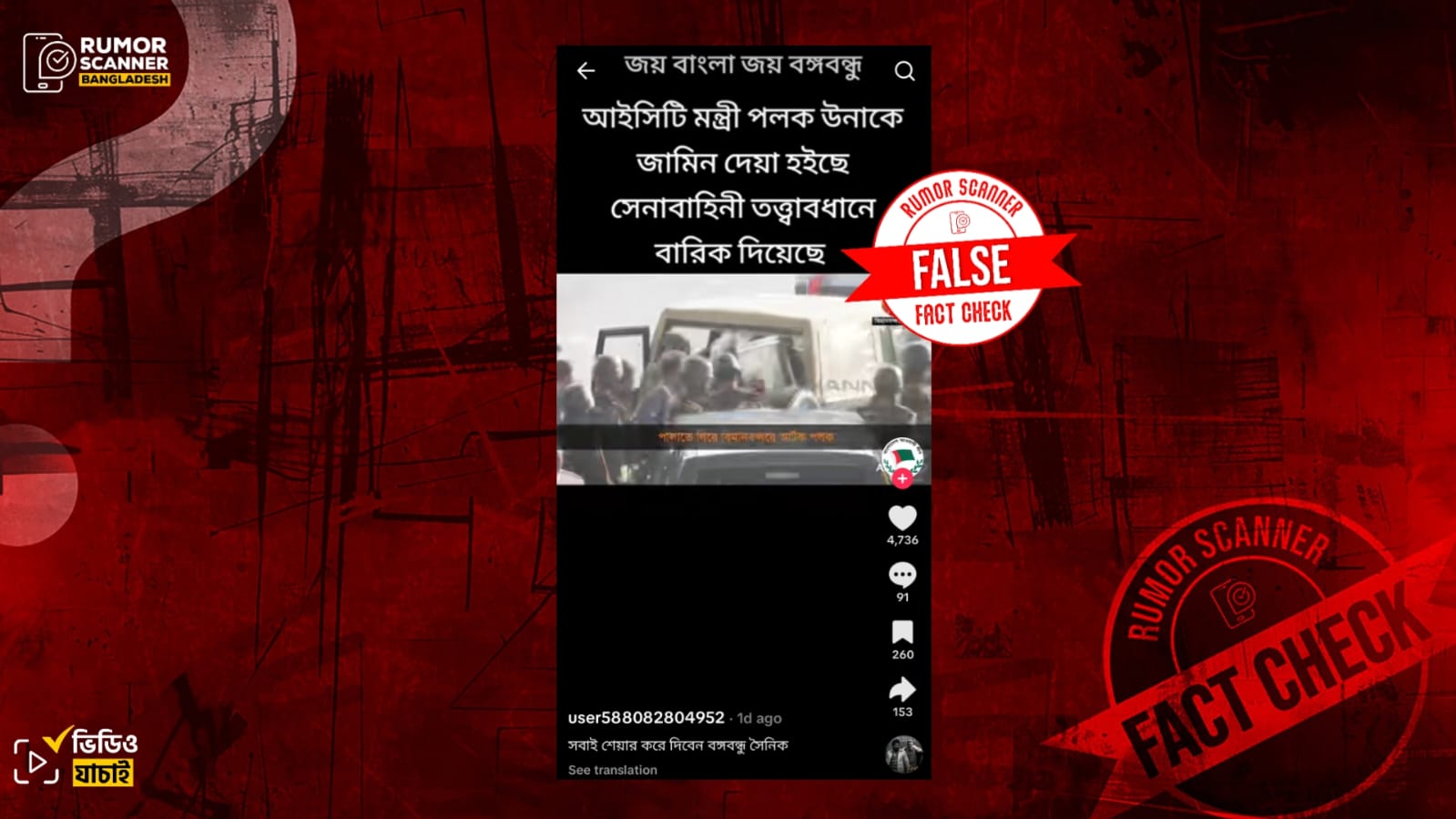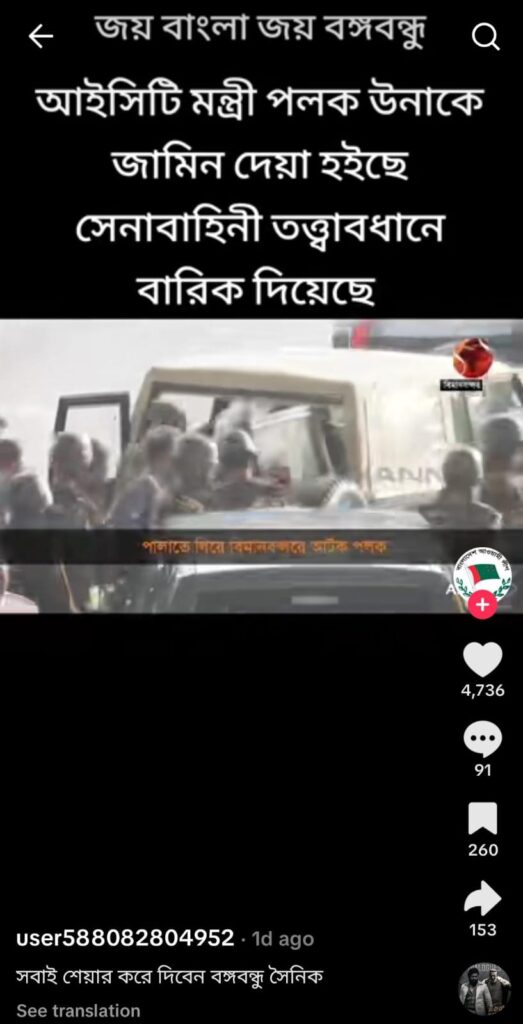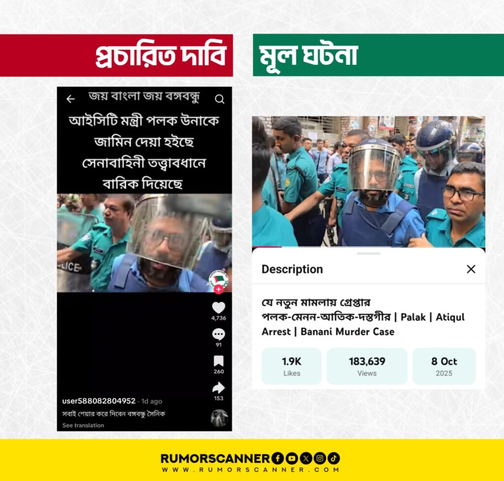 অর্থাৎ, ভিডিওটি সাম্প্রতিক সময়ে পলককে জামিনে মুক্তির পর সেনাবাহিনীর হেফাজতে নেওয়ার নয়।
