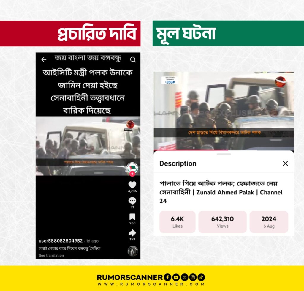 এ বিষয়ে অনুসন্ধানে ইলেকট্রনিক গণমাধ্যম চ্যানেল২৪ এর ইউটিউব চ্যানেলে ২০২৪ সালের ৬ আগস্ট “পালাতে গিয়ে আটক পলক; হেফাজতে নেয় সেনাবাহিনী” শিরোনামে প্রচারিত একটি ভিডিও খুঁজে পাওয়া যায়। উক্ত ভিডিওর ১ মিনিট ২ সেকেন্ড অংশ থেকে ১ মিনিট ৮ সেকেন্ড অংশের সাথে আলোচিত দাবিতে প্রচারিত ভিডিওর মিল রয়েছে।
