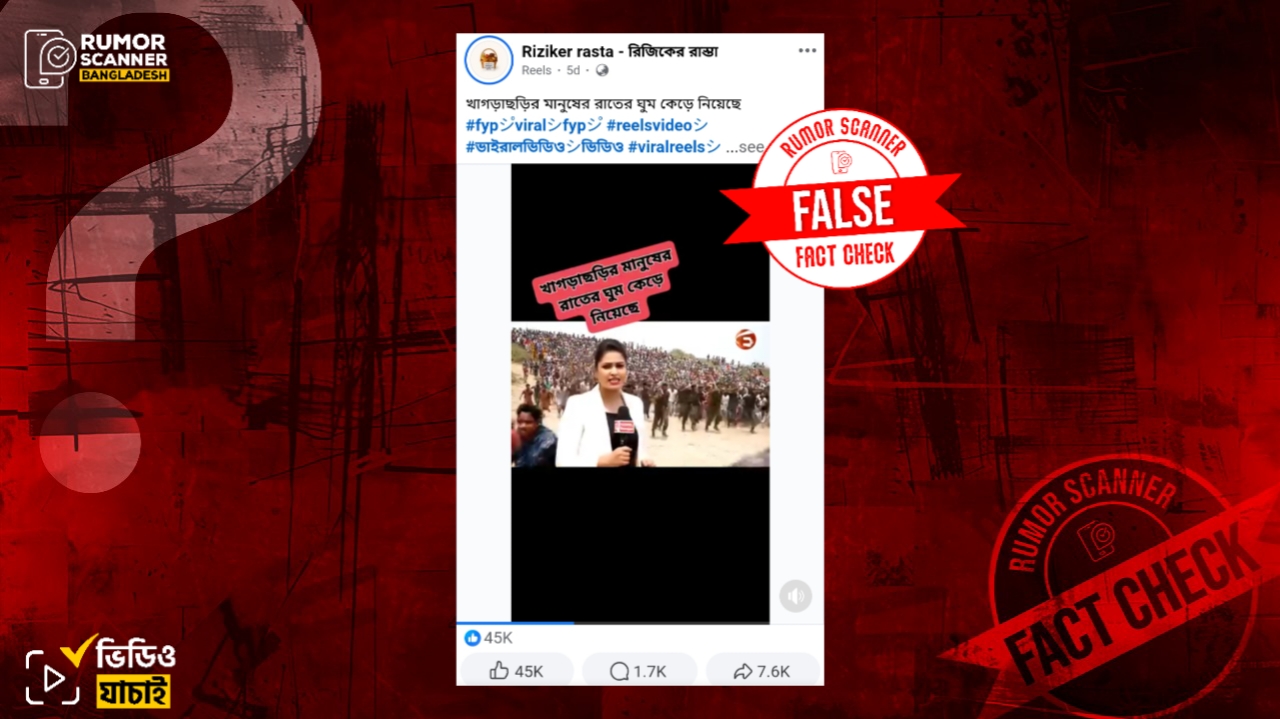 অর্থাৎ, দাবি করা হয়েছে, প্রচারিত ভিডিওটি সেনাবাহিনীর ভয়ে খাগড়াছড়ির মানুষের খাগড়াছড়ি ছেড়ে পালিয়ে যাওয়ার দৃশ্যের।