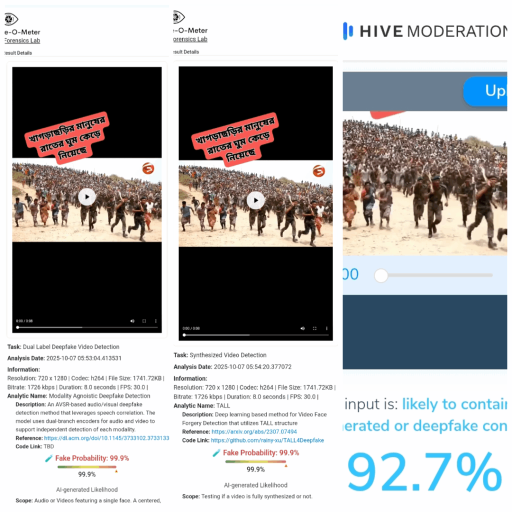 এ বিষয়ে অধিকতর নিশ্চিত হতে এআই ও ডিপফেক কনটেন্ট শনাক্তকারী প্ল্যাটফর্ম ‘ডিপফেক ও মিটার’ এ আলোচিত ভিডিওটি বিশ্লেষণ করলে এটি ভুয়া হওয়ার সম্ভাবনা বেশি দেখা যায়। প্ল্যাটফর্মটির ‘AVSRDD’ ও ‘TALL’ ডিটেক্টরের বিশ্লেষণমতে ভিডিওটি এআই তৈরি হওয়ার সম্ভাবনা ৯৯.৯ শতাংশ। এছাড়াও, এআই কনটেন্ট শনাক্তকারী আরেক প্ল্যাটফর্ম ‘হাইভ মডারেশন’ এর বিশ্লেষণমতে আলোচিত ভিডিওটি এআই দিয়ে তৈরি কনটেন্ট হওয়ার সম্ভাবনা ৯২.৭ শতাংশ।