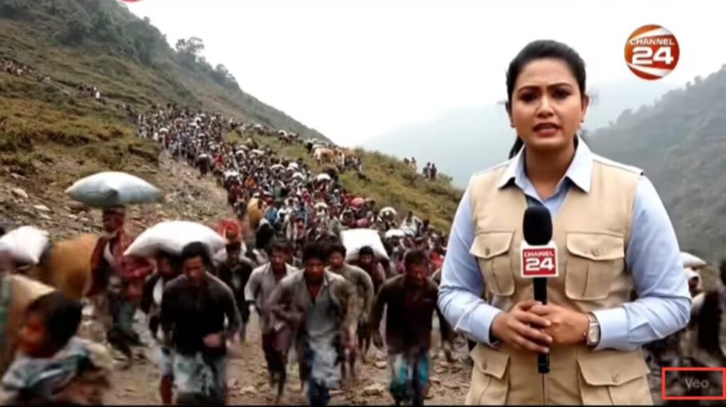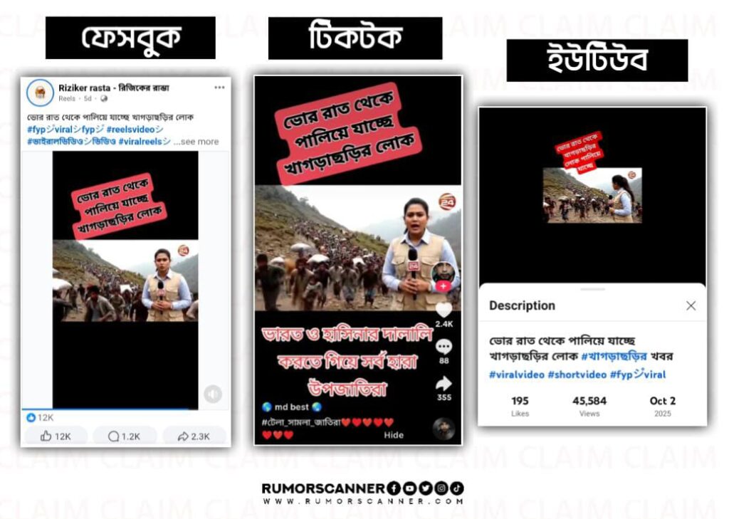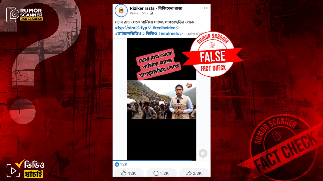 অর্থাৎ, দাবি করা হয়েছে, প্রচারিত ভিডিওটি সেনাবাহিনী ও বিজিবির ভয়ে ভোর রাত থেকে খাগড়াছড়ির মানুষের পালিয়ে যাওয়ার দৃশ্যের।