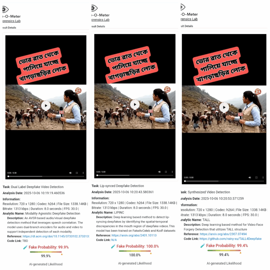 এ বিষয়ে অধিকতর নিশ্চিত হতে এআই ও ডিপফেক কনটেন্ট শনাক্তকারী প্ল্যাটফর্ম ‘ডিপফেক ও মিটার’ এ আলোচিত ভিডিওটি বিশ্লেষণ করলে এটি ভুয়া হওয়ার সম্ভাবনা বেশি দেখা যায়। প্ল্যাটফর্মটির ‘AVSRDD’, ‘LIPINC’ ও ‘TALL’ ডিটেক্টরের বিশ্লেষণমতে ভিডিওটি ভুয়া বা এআই তৈরি হওয়ার সম্ভাবনা যথাক্রমে ৯৯.৯ শতাংশ, ১০০ শতাংশ ও ৯৯.৪ শতাংশ। এছাড়াও, এআই কনটেন্ট শনাক্তকারী আরেক প্ল্যাটফর্ম ‘হাইভ মডারেশন’ এর বিশ্লেষণমতে আলোচিত ভিডিওটি এআই দিয়ে তৈরি কনটেন্ট হওয়ার সম্ভাবনা ৯৫.১ শতাংশ।