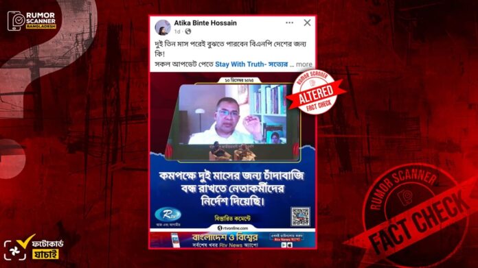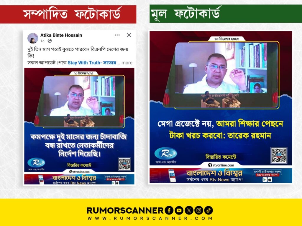 রিউমর স্ক্যানার টিমের অনুসন্ধানে জানা যায়, ‘কমপক্ষে দুই মাসের জন্য চাঁদাবাজি বন্ধ রাখতে নেতাকর্মীদের নির্দেশ দিয়েছি।’ শিরোনামে আরটিভি কোনো সংবাদ বা ফটোকার্ড প্রকাশ করেনি এবং তারেক রহমানও এরূপ কোনো মন্তব্য করেননি। প্রকৃতপক্ষে, ডিজিটাল প্রযুক্তির সহায়তায় আরটিভির ভিন্ন একটি ফটোকার্ড সম্পাদনা করে এই ফটোকার্ডটি তৈরি করা হয়েছে।