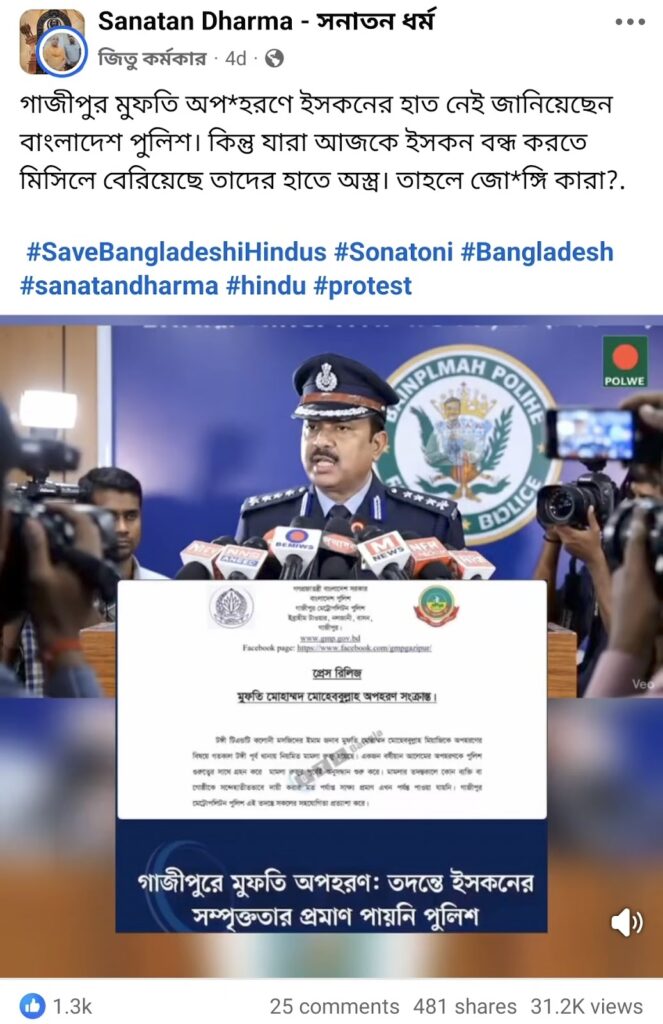 ভিডিওটিতে তিন জায়গায় তিন পোশাকের তিনজন কথিত পুলিশ সদস্যকে বক্তব্য দিতে দেখা যায়। বক্তব্যে বলতে শোনা যায়– “গাজীপুরে মুফতি অপহরণ তদন্তে বাংলাদেশ পুলিশ ইসকনের কোনো সংশ্লিষ্টতা খুঁজে পায়নি। কিন্তু যারা আজকে এই ইসকন বন্ধের জন্য বেরিয়েছেন, তারা অস্ত্রসস্ত্র ও বন্দুক নিয়ে মিছিল করেছেন। এবার বুঝুন আসল জঙ্গি কারা? এই ভিডিওটি অনেক শেয়ার করুন; যাতে সারাবিশ্বের মানুষ বুঝতে পারে যে ইসকন কোনো সন্ত্রাসী সংগঠন নয়। ওরাই সন্ত্রাসী।”