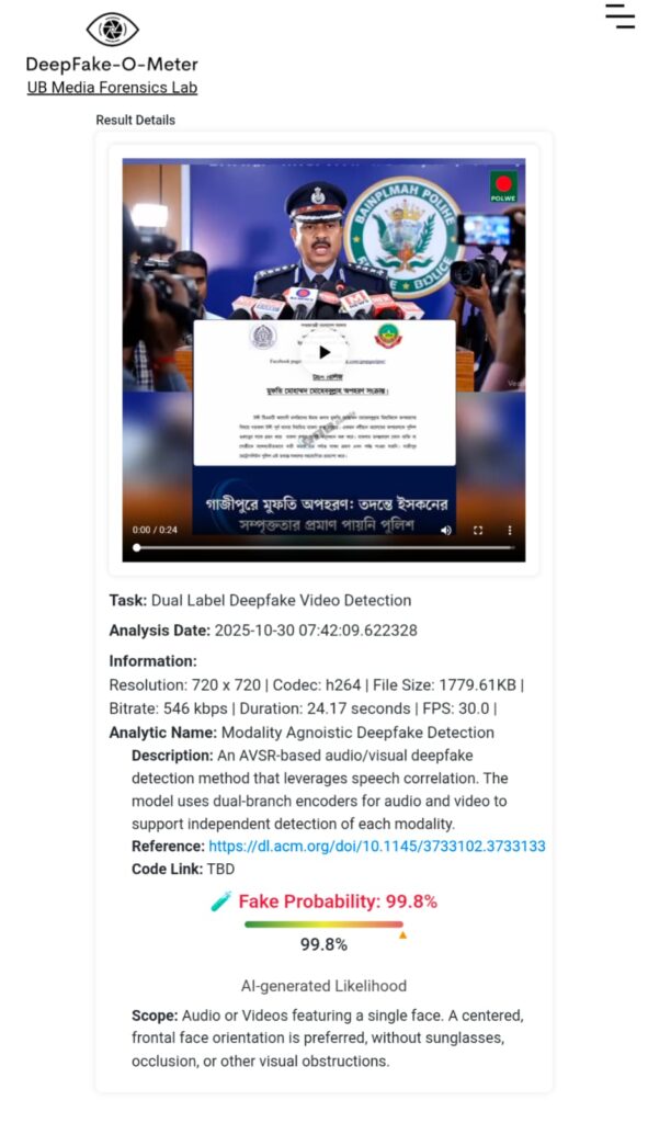 বিষয়টি নিশ্চিত হতে রিউমর স্ক্যানার ভিডিওটি ‘ডিপফেক-ও-মিটার’ টুলের ‘AVSRDD (2025)’ মডেল দিয়ে পরীক্ষা করে। বিশ্লেষণে দেখা যায়, ভিডিওটি এআই-নির্মিত হওয়ার সম্ভাবনা ৯৯.৮ শতাংশ।