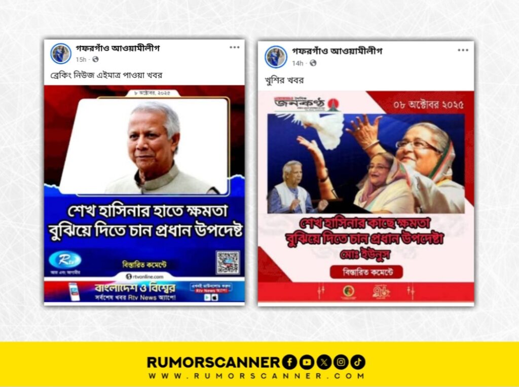 সম্প্রতি ‘শেখ হাসিনার হাতে ক্ষমতা বুঝিয়ে দিতে চান প্রধান উপদেষ্ট’ শিরোনামে ইলেকট্রনিক গণমাধ্যম আরটিভি এবং ‘শেখ হাসিনার কাছে ক্ষমতা বুঝিয়ে দিতে চান প্রধান উপদেষ্টা মোঃ ইউনুস’ শিরোনামে জনকন্ঠ এর লোগো ও ডিজাইন সংবলিত দুটি পৃথক ফটোকার্ড সামাজিক যোগাযোগ মাধ্যমে প্রচার করা হয়েছে।