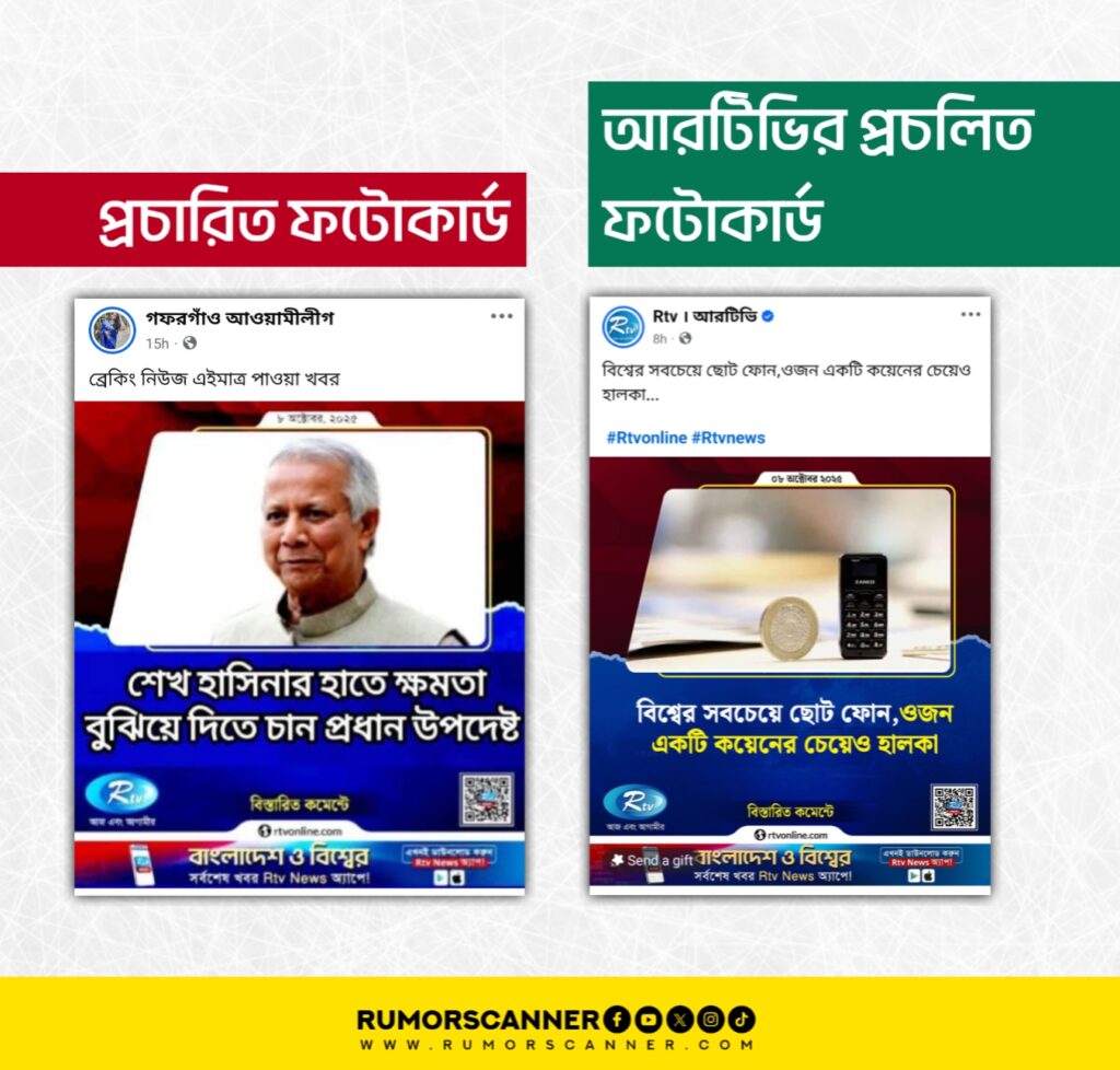 অর্থাৎ, ড. ইউনূসের নামে আরটিভির লোগো ও ডিজাইন সংবলিত ভুয়া ফটোকার্ড তৈরি করে প্রচার করা হয়েছে।