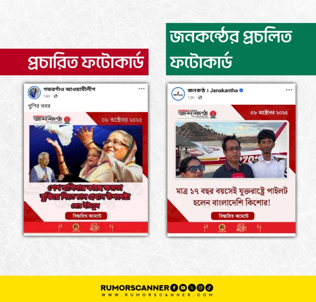 অর্থাৎ, ড. ইউনূসের নামে জনকণ্ঠের লোগো ও ডিজাইন সংবলিত ভুয়া ফটোকার্ড তৈরি প্রচার করা হয়েছে।