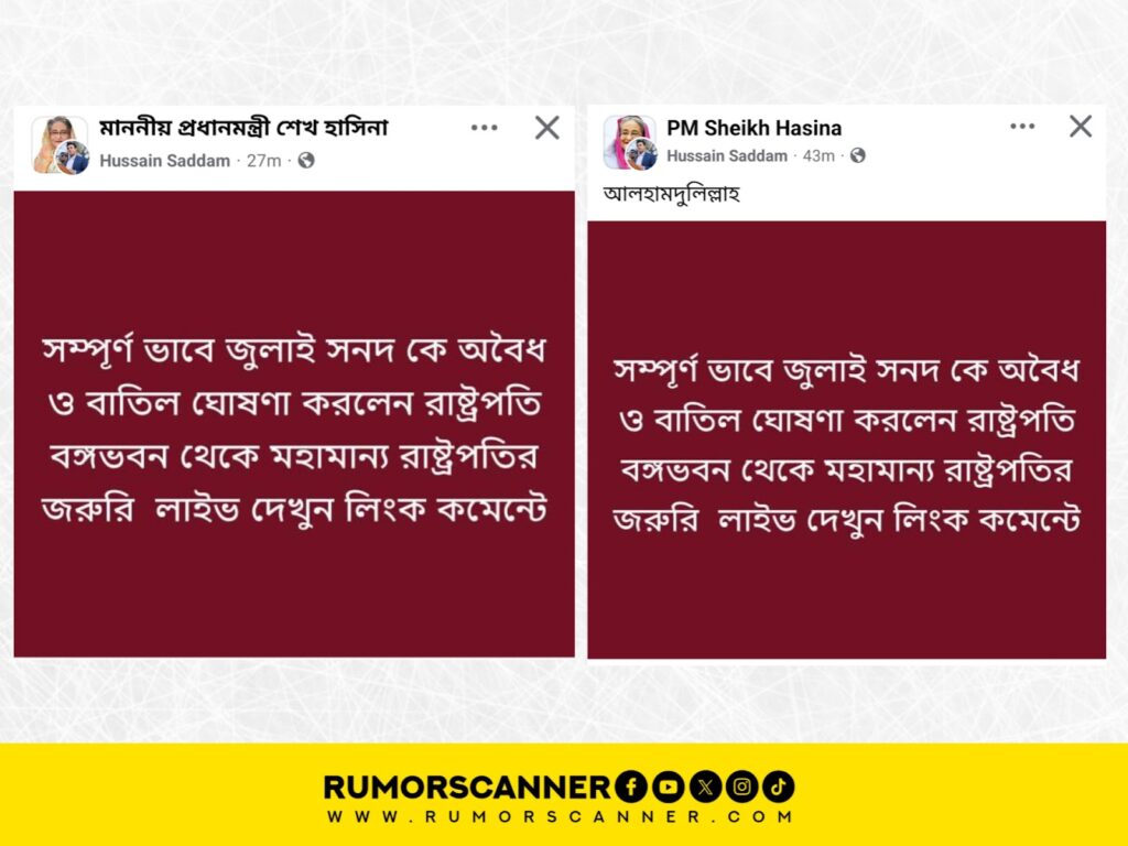 ৩০ অক্টোবর রাতে ‘জুলাই সনদ কে অবৈধ ও বাতিল ঘোষণা করলেন রাষ্ট্রপতি মোহাম্মদ সাহাবুদ্দিন’ শীর্ষক একটি দাবি সামাজিক যোগাযোগ মাধ্যমে ছড়িয়ে পড়ে।