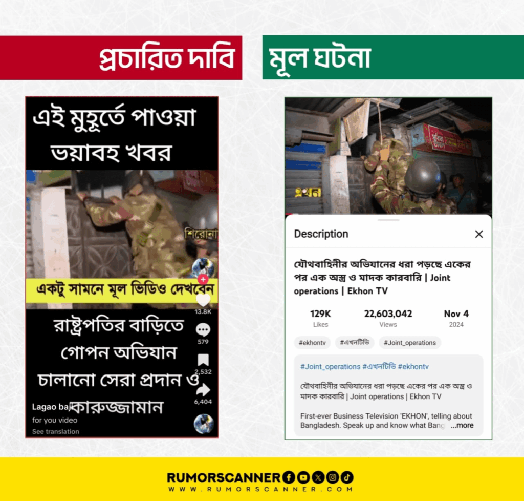 ২০ মিনিট ৫৮ সেকেন্ড সময়ের দীর্ঘ এই ভিডিওটি পর্যবেক্ষণে জানা যায়, এটি ঢাকার টঙ্গীতে অস্ত্র ও মাদক কারবারিদের বিরুদ্ধে যৌথবাহিনীর একটি অভিযানের দৃশ্য।