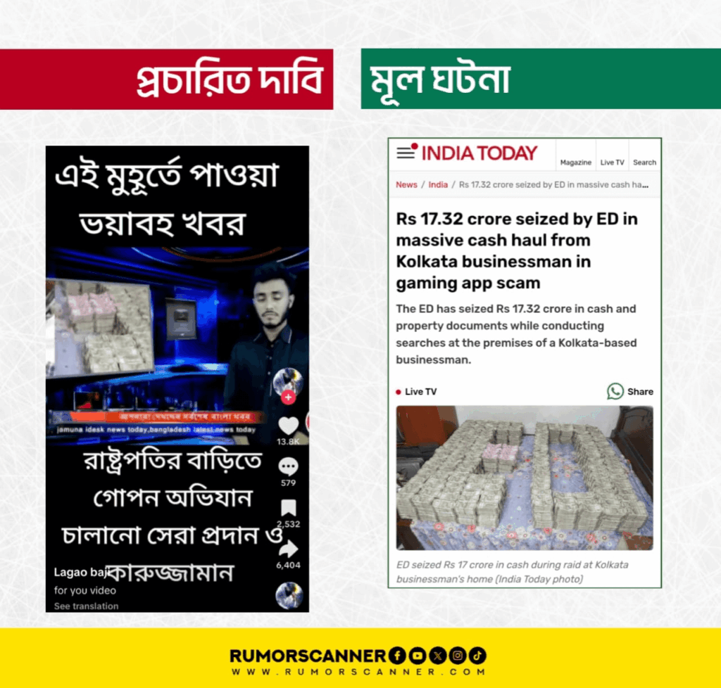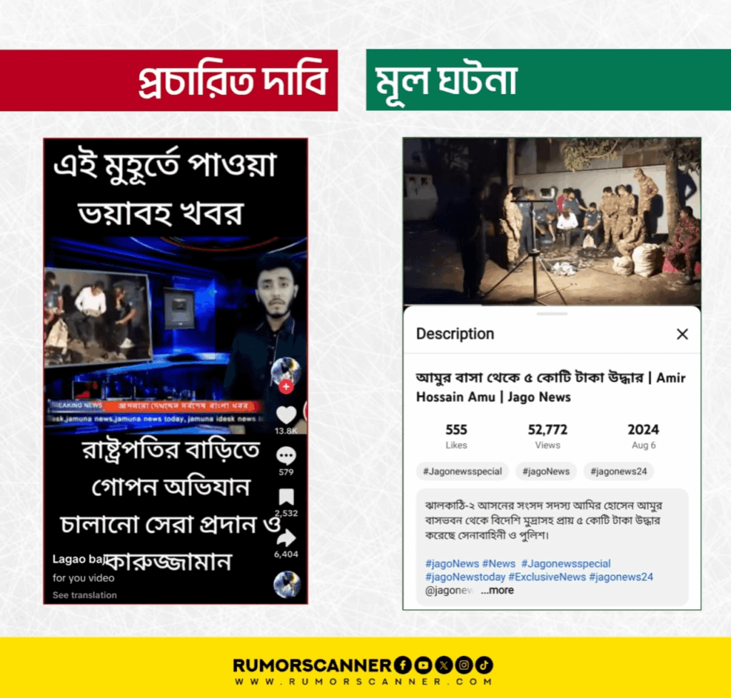এ বিষয়ে অনুসন্ধানে মূলধারার গণমাধ্যম জাগো নিউজের ইউটিউব চ্যানেলে ২০২৪ সালের ০৬ আগস্ট ‘আমুর বাসা থেকে ৫ কোটি টাকা উদ্ধার’ শিরোনামে প্রকাশিত একটি ভিডিও খুঁজে পাওয়া যায়। উক্ত ভিডিওর দৃশ্যের সঙ্গে আলোচিত দাবিতে প্রচারিত ভিডিওর ১ মিনিট ২৭ সেকেন্ড থেকে ১ মিনিট ৩৭ সেকেন্ড অংশের মিল রয়েছে।