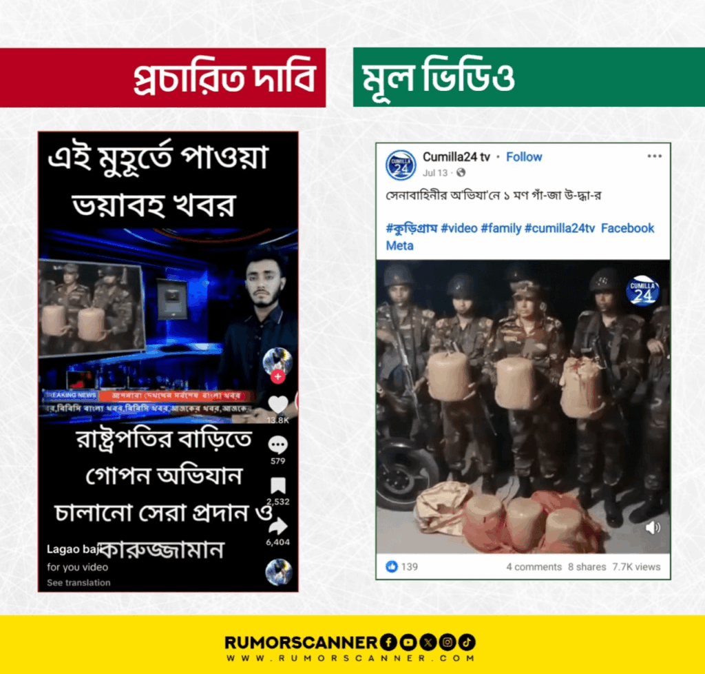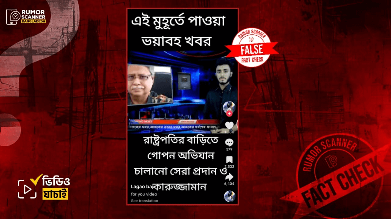 রিউমর স্ক্যানার টিমের অনুসন্ধানে জানা যায়, রাষ্ট্রপতি মো. সাহাবুদ্দিনের বাড়িতে সেনাবাহিনীর অভিযানের দাবিটি সঠিক নয় এবং প্রচারিত ভিডিওটির সাথে আলোচিত দাবির কোনো সম্পর্ক নেই। প্রকৃতপক্ষে, কোনোরূপ তথ্য প্রমাণ ছাড়াই ভিন্ন ঘটনার পুরোনো কিছু ভিডিও যুক্ত করে আলোচিত দাবি সম্বলিত ভিডিওটি প্রচার করা হয়েছে।