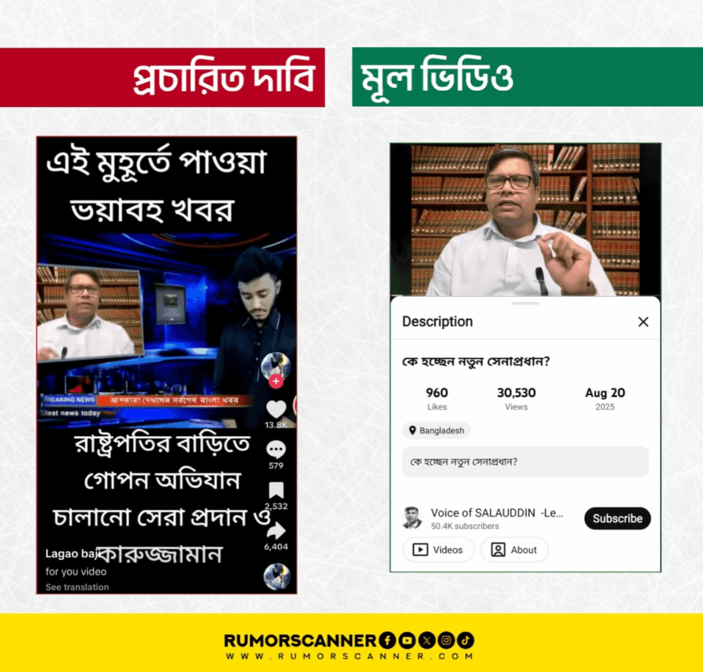 ১০ মিনিট ১২ সেকেন্ড সময়ের দীর্ঘ এই ভিডিওটি পর্যবেক্ষণে, বাংলাদেশের পরবর্তী সেনাপ্রধান কে হবেন সে বিষয়ে বিশ্লেষণধর্মী আলোচনা শুনতে পাওয়া যায়। ভিডিওটিতে শেখ হাসিনা সংগ্রাম পরিষদ, কেন্দ্রীয় কার্যনির্বাহী সংসদের সাধারণ সম্পাদক মো: সালাউদ্দিনকে কথা বলতে শোনা যায়।