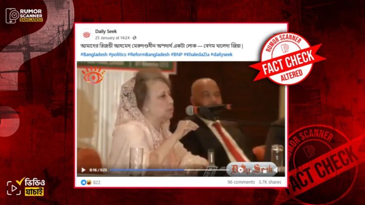 সম্প্রতি, বিএনপির চেয়ারপারসন বেগম খালেদা জিয়ার একটি ভিডিও সামাজিক মাধ্যমে প্রচার হতে দেখেছে রিউমর স্ক্যানার। ভিডিওর ক্যাপশনে, আমাদের রিজভী আহমেদ মেরুদণ্ডহীন অপদার্থ একটা লোক শীর্ষক মন্তব্য বেগম খালেদা জিয়া করেছেন বলে দাবি করা হয়। উক্ত দাবিতে ফেসবুকে প্রচারিত পোস্ট দেখুন এখানে (আর্কাইভ), এখানে (আর্কাইভ), এখানে (আর্কাইভ), এখানে (আর্কাইভ), এখানে (আর্কাইভ)। উক্ত দাবিতে ইনস্টাগ্রামে প্রচারিত ভিডিও … পড়তে থাকুন এই ভিডিওতে রুহুল কবির রিজভীকে মেরুদণ্ডহীন অপদার্থ বলেননি খালেদা জিয়া