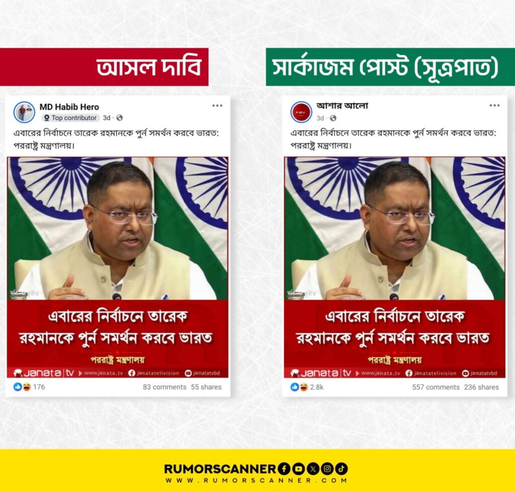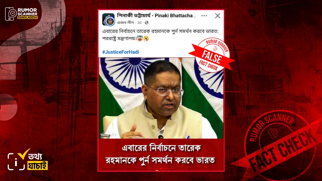 রিউমর স্ক্যানার টিমের অনুসন্ধানে জানা যায়, ভারতের পররাষ্ট্র মন্ত্রণালয়ের মুখপাত্র রণধীর জয়সওয়াল আসন্ন বাংলাদেশের ত্রয়োদশ জাতীয় সংবাদ নির্বাচনে বিএনপির ভারপ্রাপ্ত চেয়ারম্যান তারেক রহমানকে ভারত পূর্ণ সমর্থন দেওয়া সংক্রান্ত কোনো মন্তব্য করেননি। প্রকৃতপক্ষে, উক্ত দাবিতে একটি স্যাটায়ার পেজের ব্যঙ্গাত্মক পোস্টকে আসল খবর দাবিতে প্রচার করা হয়েছে।