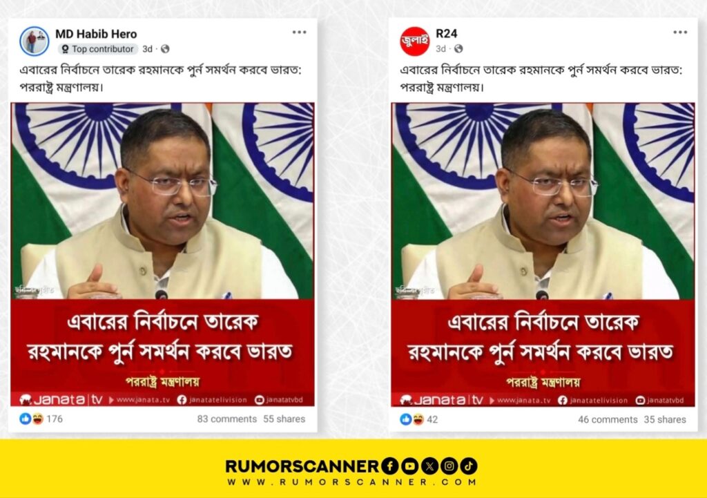 সম্প্রতি, ‘এবারের নির্বাচনে তারেক রহমানকে পুর্ন সমর্থন করবে ভারত’ শীর্ষক মন্তব্যটি ভারতের পররাষ্ট্র মন্ত্রণালয়ের মুখপাত্র রণধীর জয়সওয়াল করেছেন দাবিতে একটি ডিজিটাল ব্যানার ইন্টারনেটে ছড়িয়ে পড়েছে।