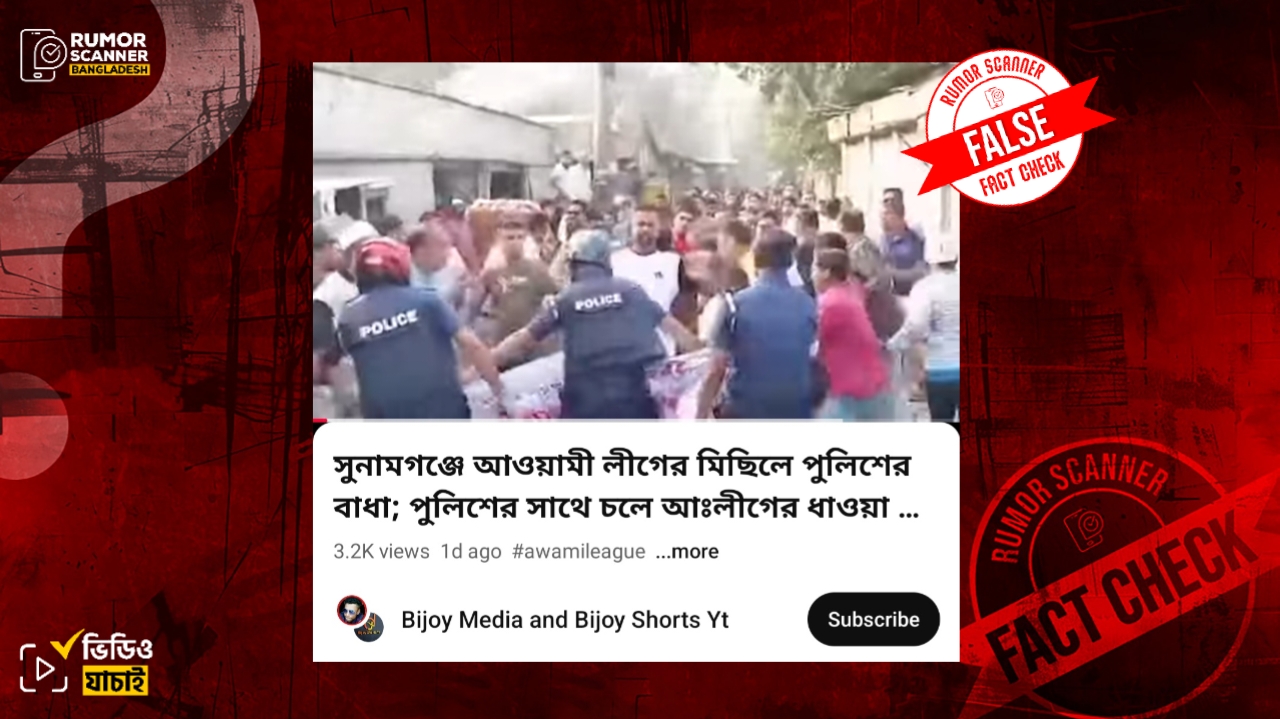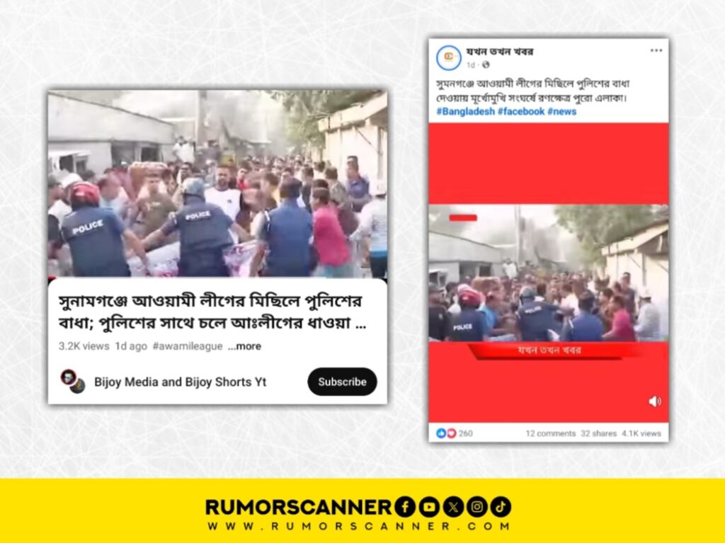 সম্প্রতি ‘সুনামগঞ্জে আওয়ামী লীগের মিছিলে পুলিশের বাধা; পুলিশের সাথে চলে আঃলীগের ধাওয়া পালটা ধাওয়া’ ক্যাপশনে একটি ভিডিও ইন্টারনেটে বিভিন্ন প্লাটফর্মে প্রচার করা হয়েছে৷