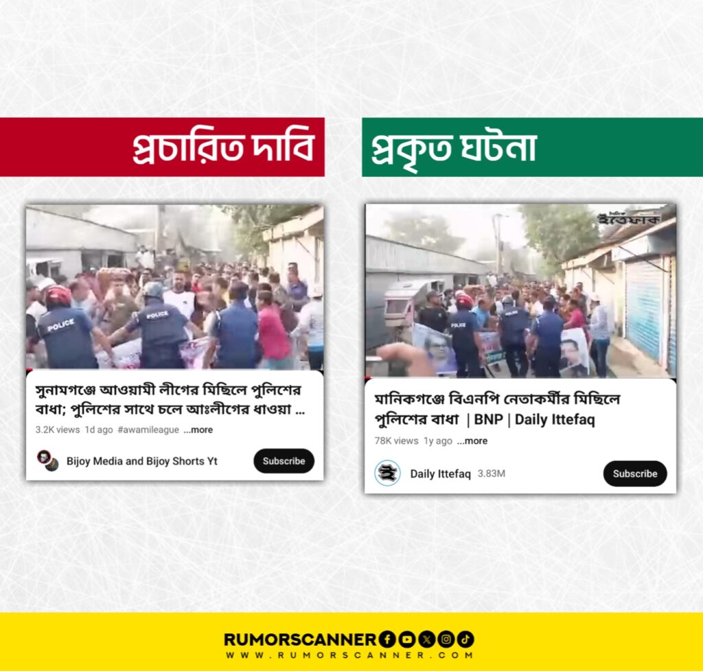 রিউমর স্ক্যানার টিমের অনুসন্ধানে জানা যায়, প্রচারিত ভিডিওটি সাম্প্রতিক সময়ে সুনামগঞ্জে আওয়ামী লীগের কোনো মিছিলে পুলিশের বাধা ও উভয় পক্ষের সংঘর্ষের ঘটনার নয়। প্রকৃতপক্ষে, ২০২৩ সালে মানিকগঞ্জে বিএনপি-পুলিশ সংঘর্ষের ভিডিওকে আলোচিত দাবিতে প্রচার করা হয়েছে৷