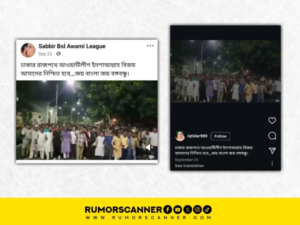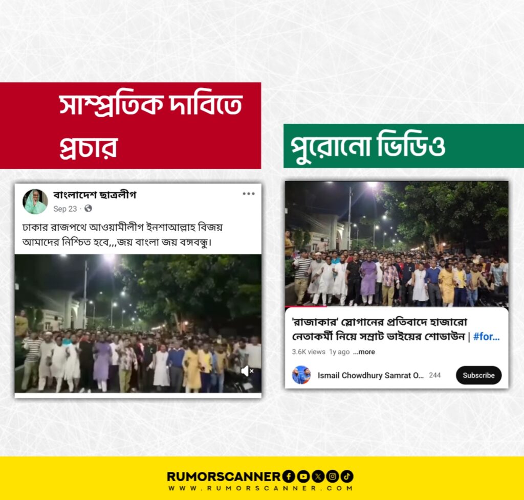 গেল সেপ্টেম্বরে ‘ঢাকার রাজপথে আওয়ামীলীগ ইনশাআল্লাহ বিজয় আমাদের নিশ্চিত হবে,,,জয় বাংলা জয় বঙ্গবন্ধু।’ ক্যাপশনে বাংলাদেশ আওয়ামী লীগের সাম্প্রতিক মিছিল দাবিতে একটি ভিডিও ইন্টারনেটে বিভিন্ন প্লাটফর্মে প্রচার করা হয়েছে।