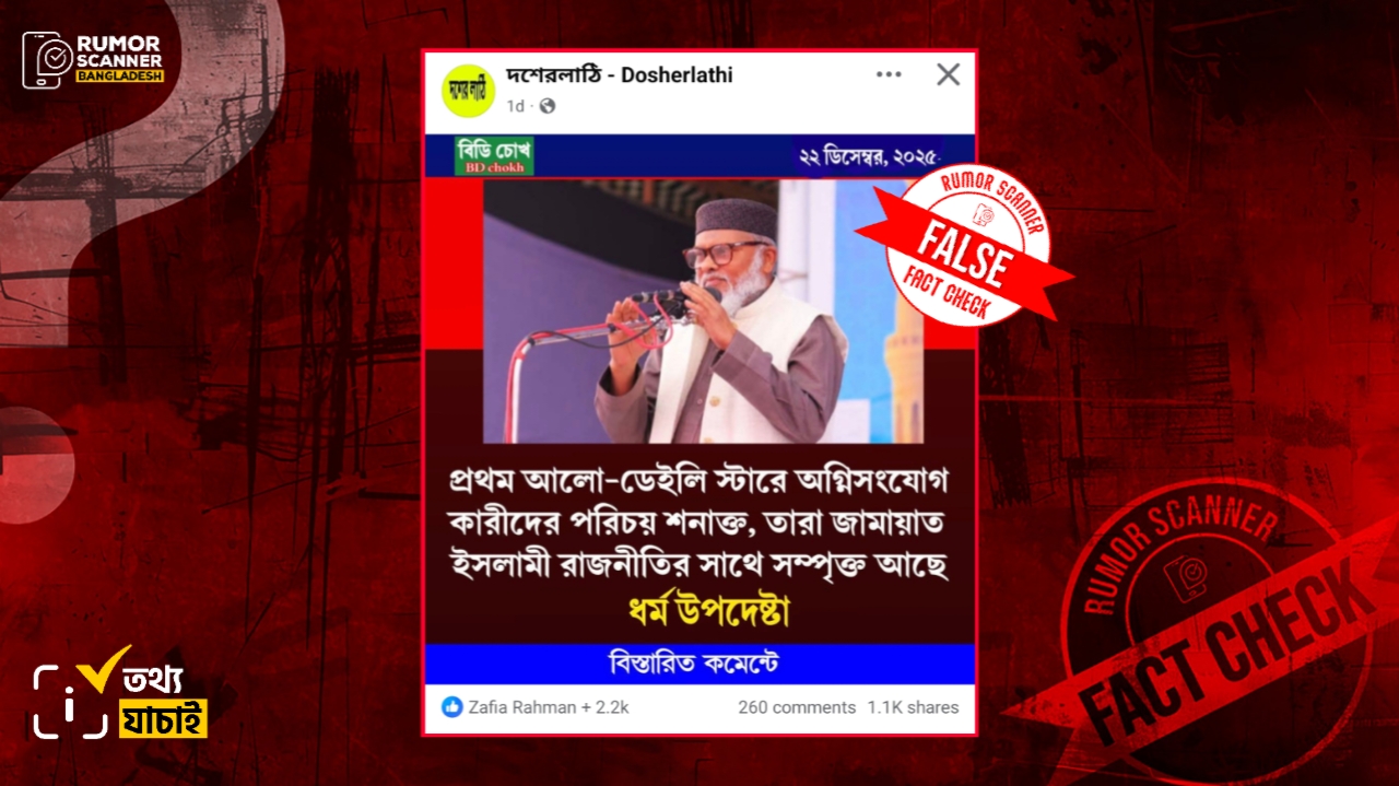 রিউমর স্ক্যানার টিমের অনুসন্ধানে জানা যায়, ‘প্রথম আলো-ডেইলি স্টারে অগ্নিসংযোগকারীদের পরিচয় শনাক্ত, তারা জামায়াত ইসলামী রাজনীতির সাথে সম্পৃক্ত আছে’ শীর্ষক কোনো মন্তব্য ধর্ম উপদেষ্টা আ ফ ম খালিদ হোসেন করেননি বরং, কোনো তথ্যপ্রমাণ ছাড়াই আলোচিত দাবিগুলো প্রচার করা হচ্ছে।