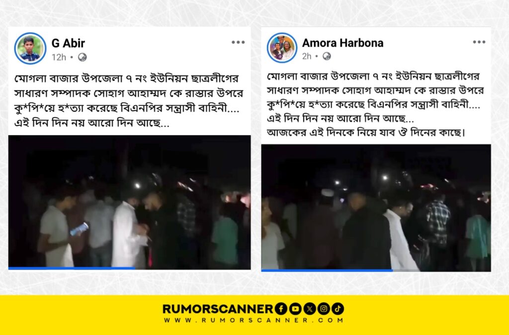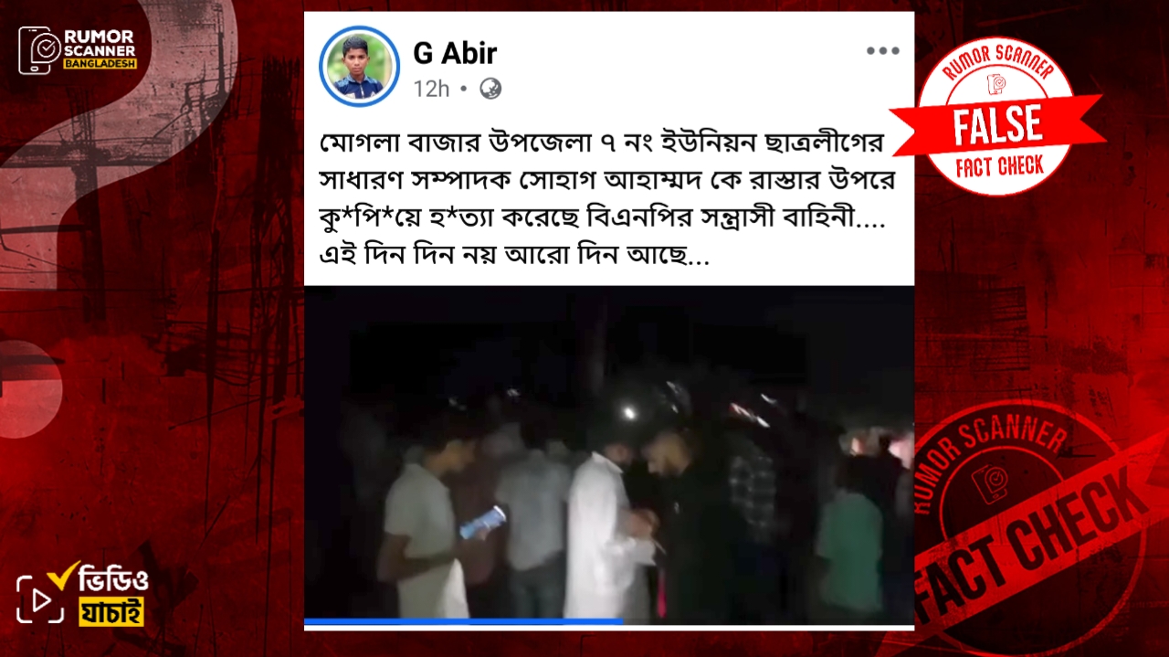 অতি সম্প্রতি, “মোগলা বাজার উপজেলা ৭ নং ইউনিয়ন ছাত্রলীগের সাধারণ সম্পাদক সোহাগ আহাম্মদ কে রাস্তার উপরে কু*পি*য়ে হ*ত্যা করেছে বিএনপির সন্ত্রাসী বাহিনী।” শীর্ষক ক্যাপশনে একটি ভিডিও সামাজিক যোগাযোগ মাধ্যমে প্রচার করা হয়েছে।