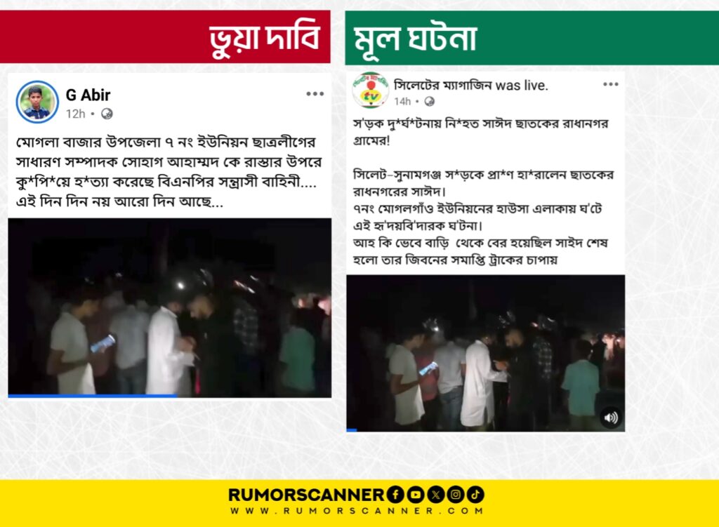 সুতরাং, সিলেটে সড়ক দুর্ঘটনায় সাধারণ ব্যক্তির নিহতের ভিডিওকে বিএনপি নেতাকর্মীদের হামলায় ছাত্রলীগের নেতা নিহত দাবিতে প্রচার করা হয়েছে; যা মিথ্যা।