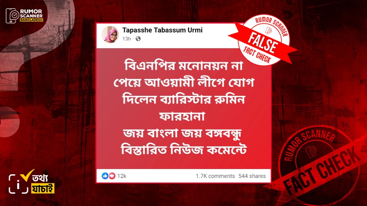 এরই প্রেক্ষিতে, ‘বিএনপির মনোনয়ন না পেয়ে আওয়ামী লীগে যোগ দিলেন ব্যারিস্টার রুমিন ফারহানা’ শীর্ষক একটি তথ্য সামাজিক যোগাযোগবমাধ্যমে ছড়িয়ে পড়েছে।