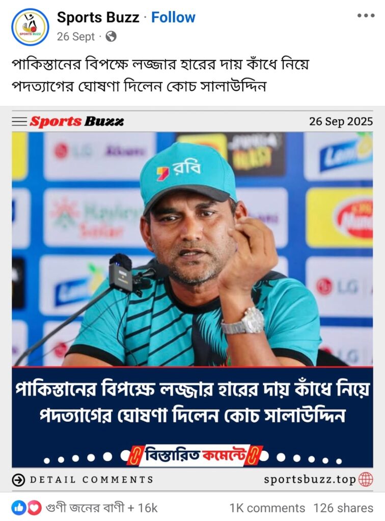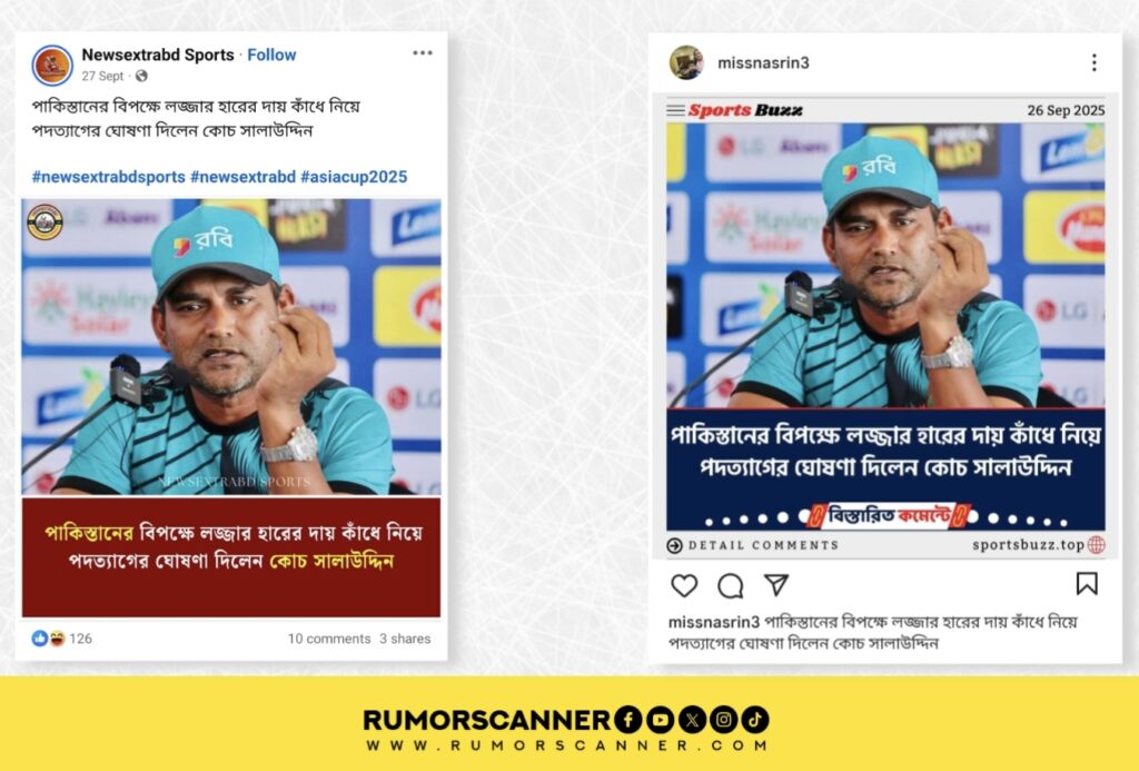 গত ২৫ সেপ্টেম্বর এশিয়া কাপের সেমিফাইনালের ম্যাচে দুবাই আন্তর্জাতিক ক্রিকেট স্টেডিয়ামে পাকিস্তানের বিপরীতে মাঠে নামে বাংলাদেশ ক্রিকেট দল। পাকিস্তানের ১৩৫ রানের টার্গেটে মাত্র ১১ রানের ব্যবধানে ১২৪ করে ঘরে ফেরে বাংলাদেশ। এরই প্রেক্ষিতে, উক্ত ম্যাচ হারায় দায় কাঁধে নিয়ে পদত্যাগের ঘোষণা দিলেন কোচ মোহাম্মদ সালাউদ্দিন- শীর্ষক একটি তথ্য সামাজিক যোগাযোগমাধ্যমে ছড়িয়ে পড়েছে।