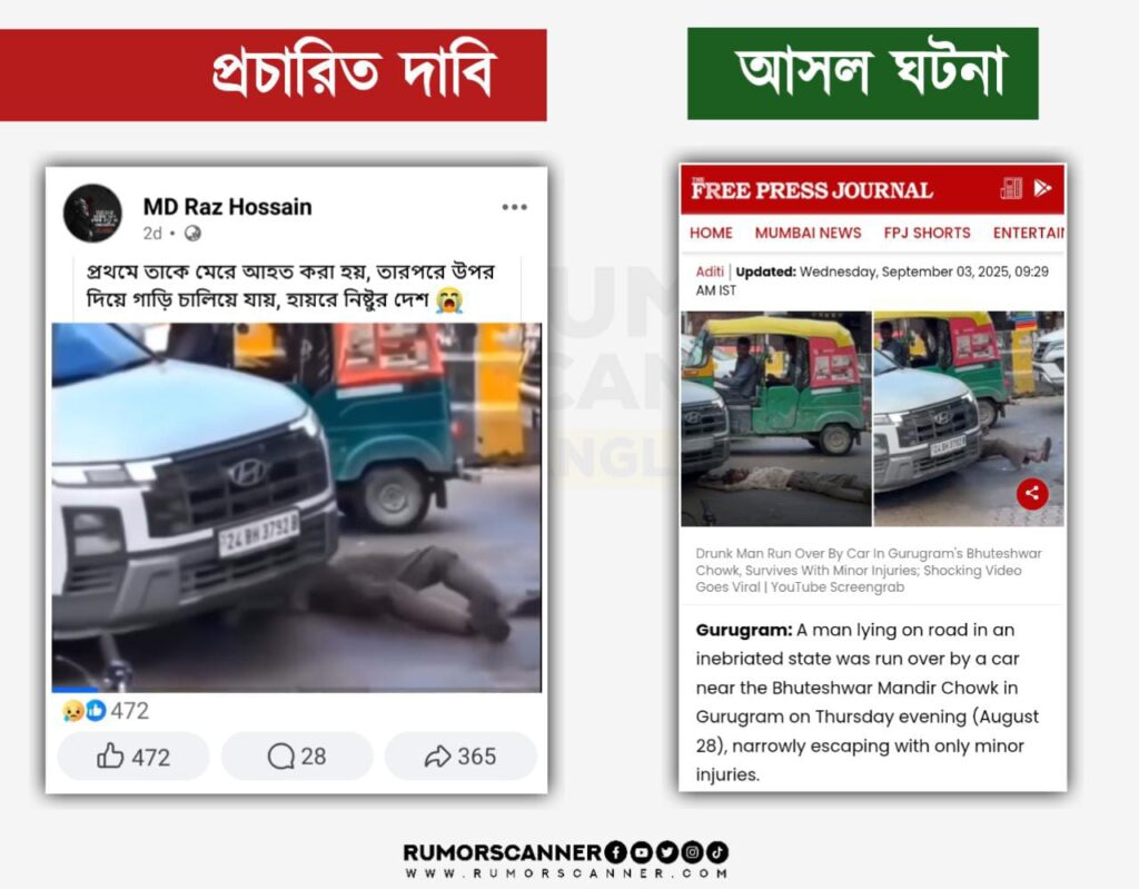 সুতরাং, ভারতে এক ব্যক্তির ওপর দিয়ে গাড়ি চালানোর দৃশ্যকে বাংলাদেশের ঘটনা দাবিতে প্রচার করা হয়েছে; যা মিথ্যা।