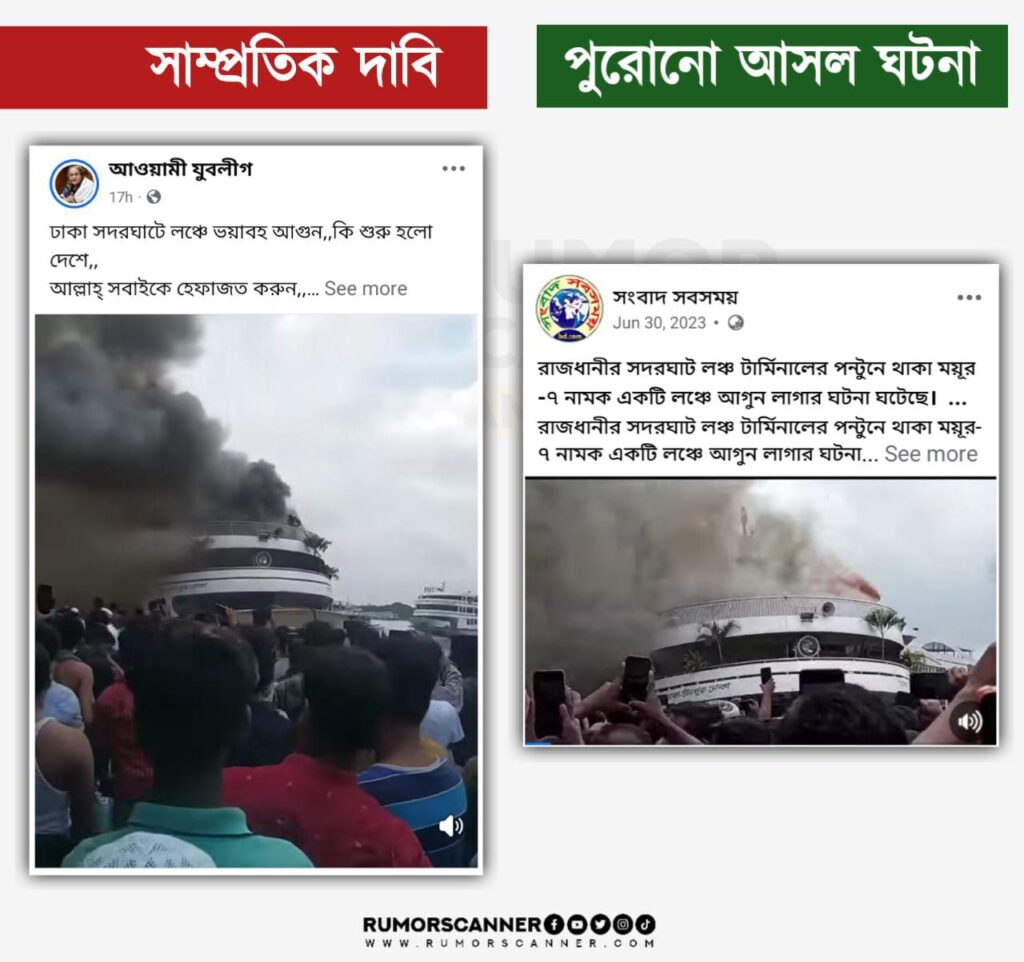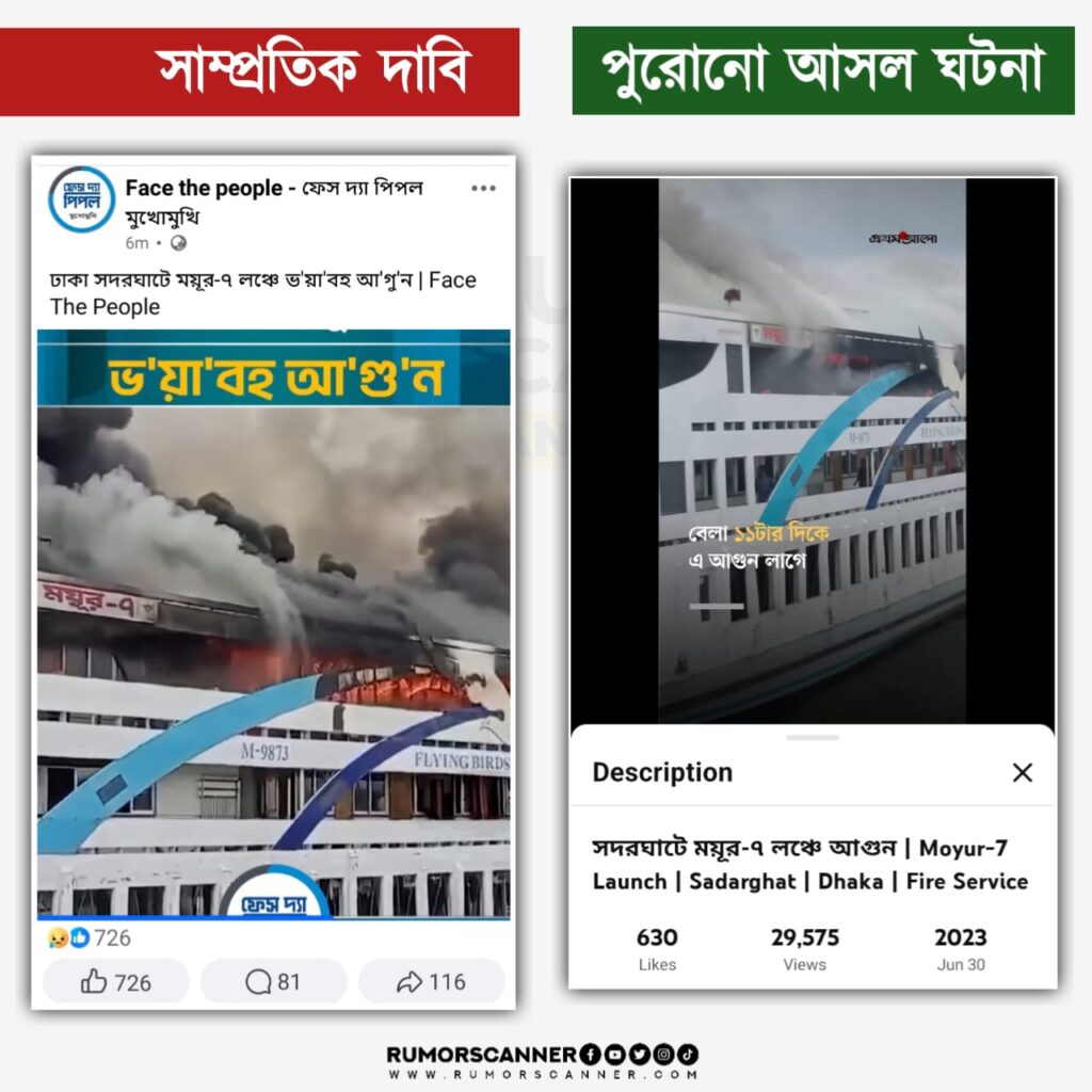 এ বিষয়ে অনুসন্ধানে জাতীয় দৈনিক ‘প্রথম আলো’র ইউটিউব চ্যানেলে ‘সদরঘাটে ময়ূর-৭ লঞ্চে আগুন’ শিরোনামে ২০২৩ সালের ৩০ জুনে প্রচারিত একটি ভিডিও পাওয়া যায়। ভিডিওটির সাথে আলোচিত দাবিতে প্রচারিত ভিডিওটির তুলনা করলে মিল পাওয়া যায়। এছাড়াও, সেসময় প্রথম আলোর ফেসবুক পেজেও আলোচিত ভিডিওটি প্রচার করা হয়েছে।
