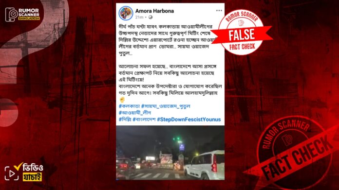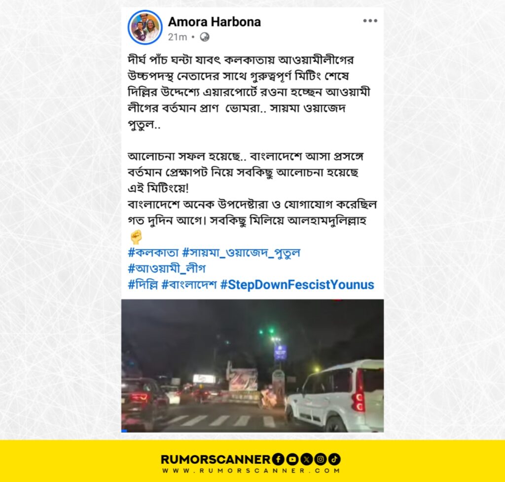 সম্প্রতি, “দীর্ঘ পাঁচ ঘন্টা যাবৎ কলকাতায় আওয়ামীলীগের উচ্চপদস্থ নেতাদের সাথে গুরুত্বপূর্ণ মিটিং শেষে দিল্লির উদ্দেশ্যে এয়ারপোর্টে রওনা হচ্ছেন আওয়ামী লীগের বর্তমান প্রাণ ভোমরা.. সায়মা ওয়াজেদ পুতুল” শীর্ষক ক্যাপশনে একটি ভিডিও সামাজিক যোগাযোগ মাধ্যমে প্রচার করা হয়েছে।