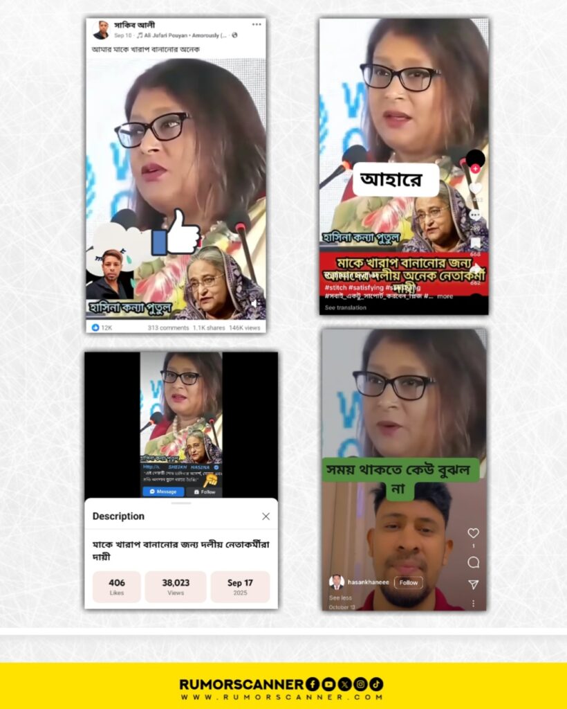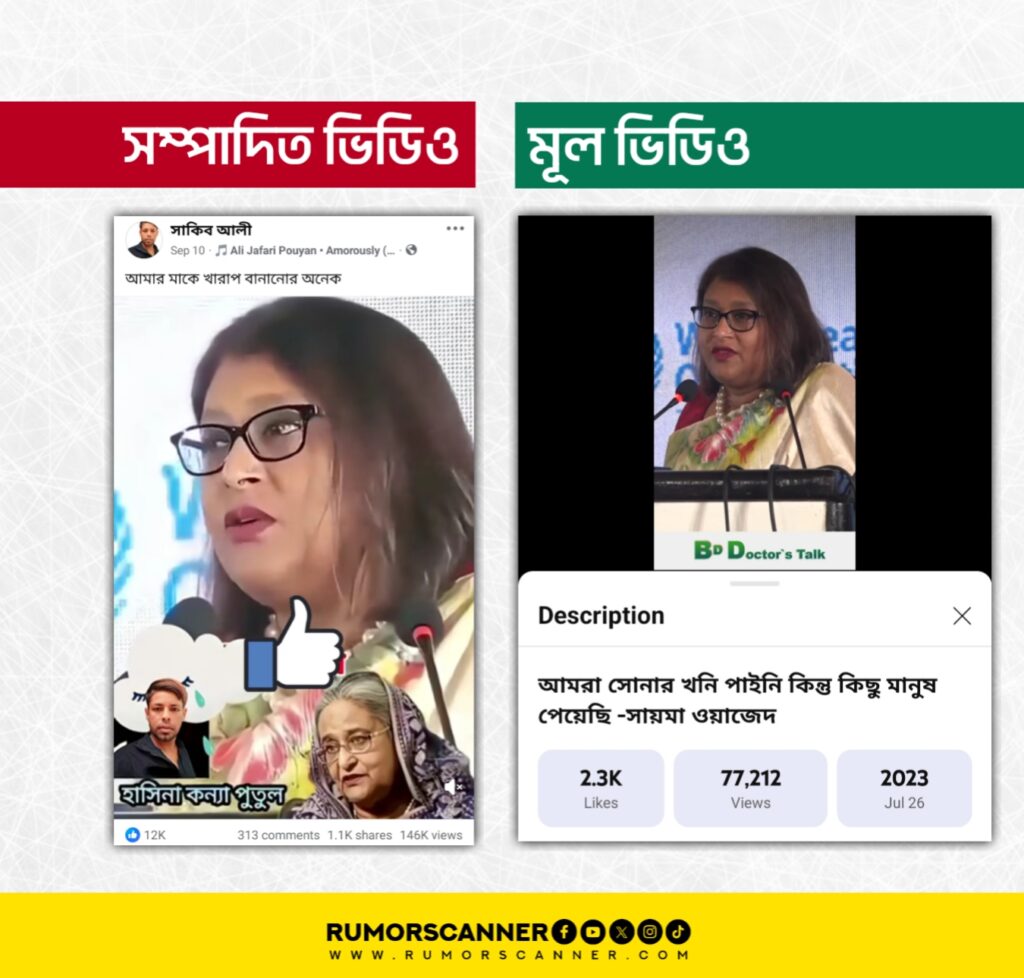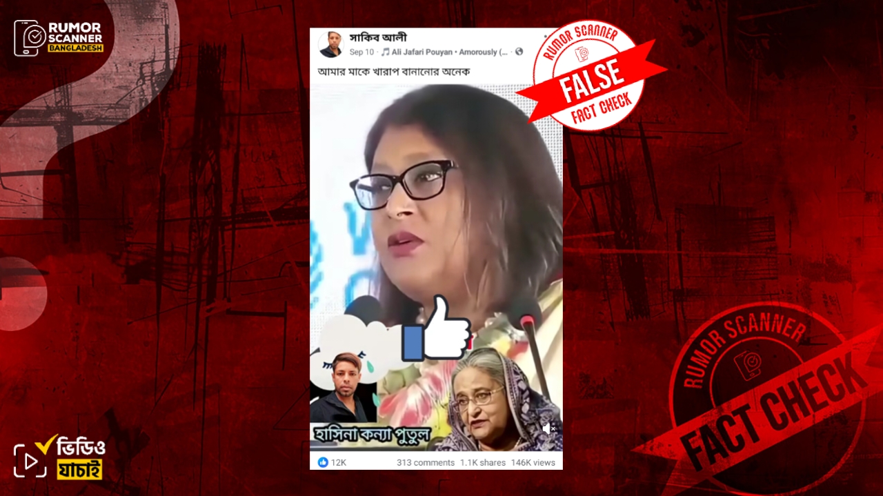 সম্প্রতি ‘মাকে খারাপ বানানোর জন্য আমাদের দলীয় অনেক নেতাকর্মী দায়ী’ শিরোনামে সাবেক প্রধানমন্ত্রী শেখ হাসিনার কন্যা সায়মা ওয়াজেদ পুতুলের বক্তব্য দাবিতে একটি ভিডিও ইন্টারনেটে বিভিন্ন প্লাটফর্মে প্রচার করা হয়েছে৷