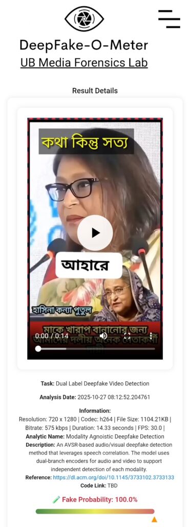 উক্ত ভিডিওটির বিষয়ে অধিকতর নিশ্চিত হতে এআই কনটেন্ট শনাক্তকারী প্ল্যাটফর্ম ‘DeepFake-O-Meter’ এর ‘AVSRDD (2025)’ মডেলের মাধ্যমে ভিডিওটি পরীক্ষা দেখা যায়, ভিডিওটি এআই দিয়ে তৈরি হওয়ার সম্ভাবনা ১০০ শতাংশ।