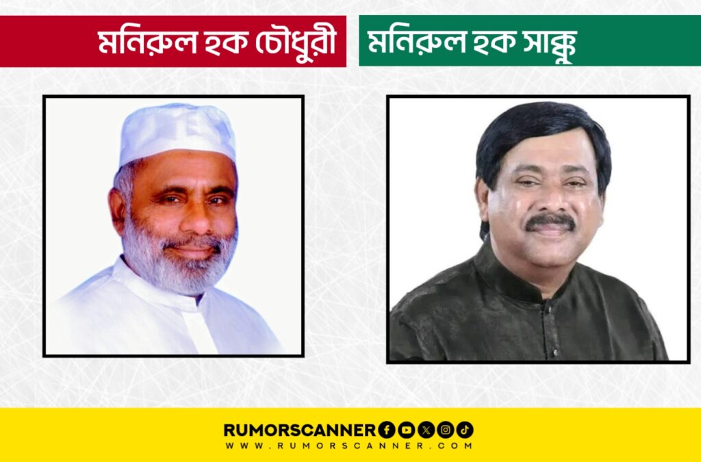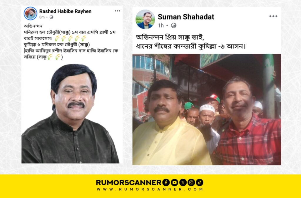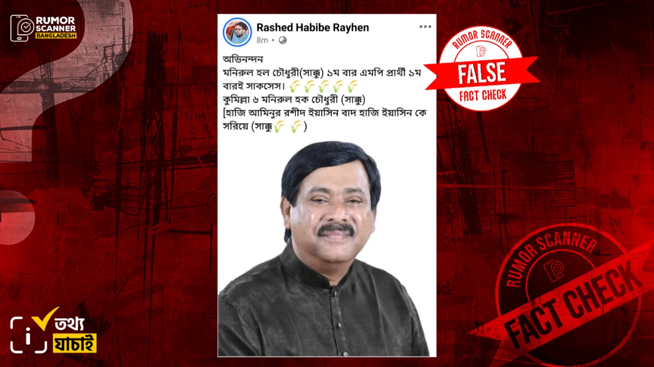রিউমর স্ক্যানার টিমের অনুসন্ধানে জানা যায়, কুমিল্লা-৬ আসন থেকে মনিরুল হক সাক্কু বিএনপির মনোনয়ন পাননি বরং এই আসনে দলটির মনোনয়ন পেয়েছেন মনিরুল হক চৌধুরী। দু’জন ভিন্ন ব্যক্তি।