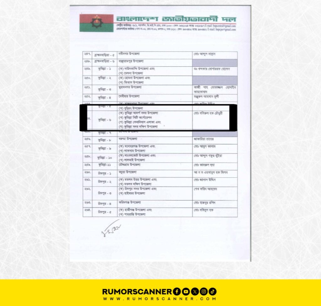 আগামী জাতীয় সংসদ নির্বাচনে ২৩৭ আসনে প্রার্থী ঘোষণা করেছে বিএনপি। আজ (০৩ নভেম্বর) এই ঘোষণা দেওয়া হয়। এরই প্রেক্ষিতে সামাজিক যোগাযোগ মাধ্যমের কিছু পোস্টে দাবি করা হচ্ছে, কুমিল্লা-৬ আসন থেকে বিএনপির মনোনয়ন পেয়েছেন মনিরুল হক সাক্কু।
