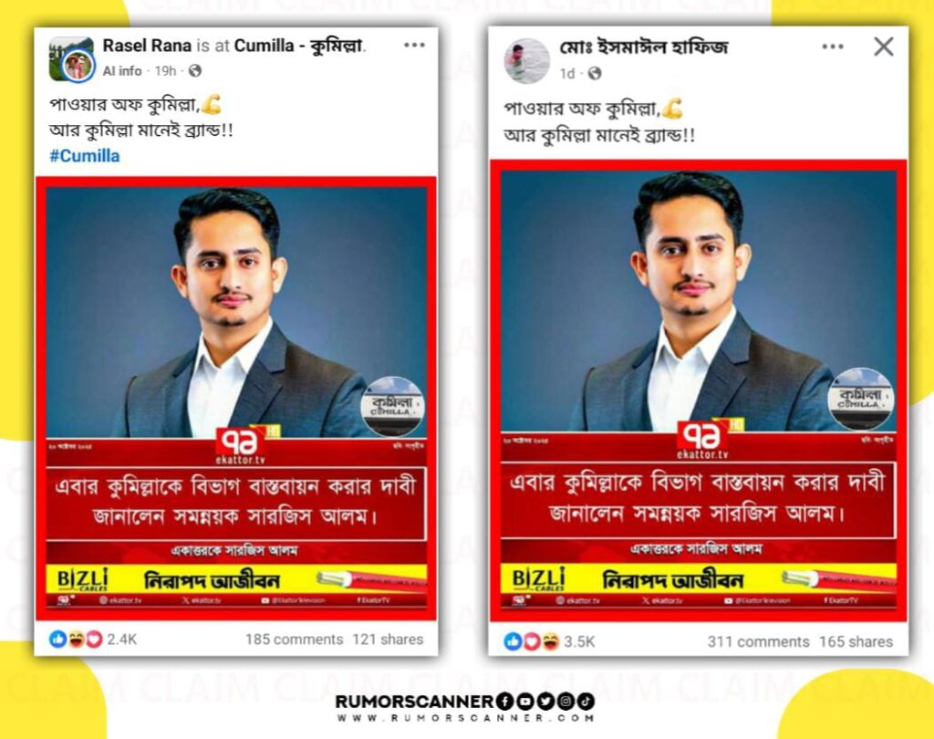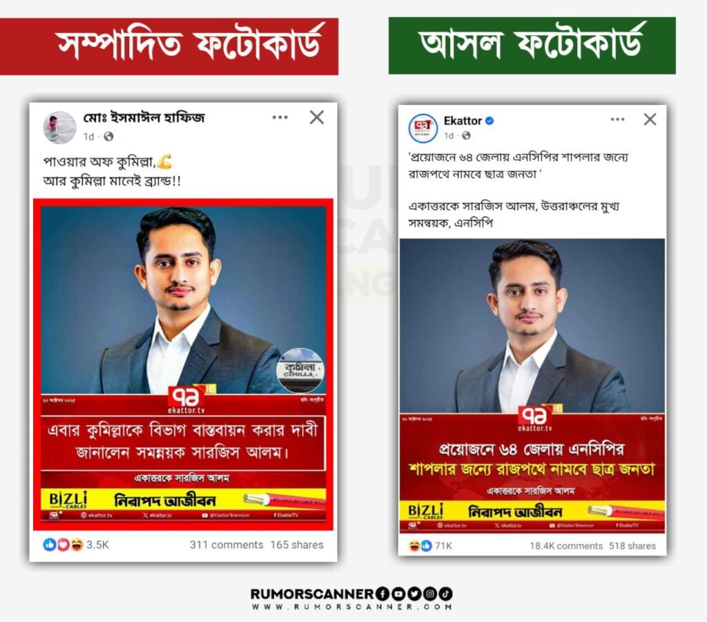 তবে, গত ২০ অক্টোবরে “প্রয়োজনে ৬৪ জেলায় এনসিপির শাপলার জন্যে রাজপথে নামবে ছাত্র জনতা | একাত্তরকে সারজিস আলম” শীর্ষক শিরোনামে একাত্তর টিভির ফেসবুক পেজে প্রচারিত একটি ফটোকার্ড খুঁজে পাওয়া যায়। ফটোকার্ডটি পর্যালোচনা করে আলোচিত দাবিতে প্রচারিত ফটোকার্ডের ছবি ও গ্রাফিক্যাল ডিজাইনের সাথে এর সাদৃশ্য খুঁজে পাওয়া যায়। তবে আলোচিত ফটোকার্ডটিতে ‘প্রয়োজনে ৬৪ জেলায় এনসিপির শাপলার জন্যে রাজপথে নামবে ছাত্র জনতা’ শীর্ষক বাক্যের পরিবর্তে ‘এবার কুমিল্লাকে বিভাগ বাস্তবায়ন করার দাবী জানালেন সমন্নয়ক সারজিস আলম’ শীর্ষক বাক্য লেখা হয়েছে। এছাড়া, ফন্টেও অমিল রয়েছে এবং সারজিস আলমের ছবির ডানপাশে নিচের কোণায় কুমিল্লা লেখা সম্বলিত একটি ছবি সংযুক্ত করা হয়েছে।