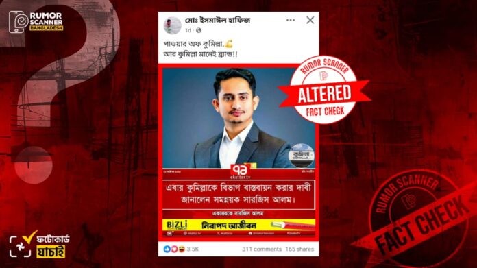 কুমিল্লা নামে বিভাগ প্রসঙ্গে সারজিস আলমকে জড়িয়ে একাত্তর টিভির নামে সম্পাদিত ফটোকার্ড প্রচার