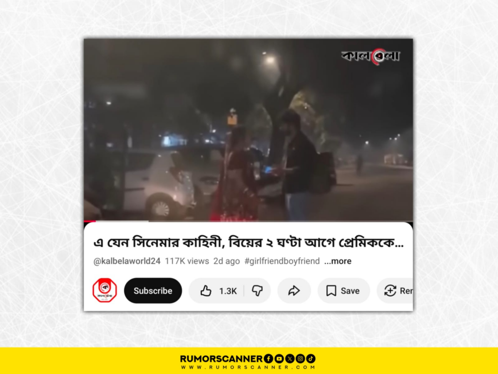 রিউমর স্ক্যানার টিমের অনুসন্ধানে জানা যায়, বিয়ের দুই ঘণ্টা আগে প্রেমিকের সঙ্গে সাক্ষাতের আলোচিত ভিডিওটি কোনো বাস্তব ঘটনার দৃশ্য নয়। প্রকৃতপক্ষে, এটি ভারতীয় একজন কনটেন্ট ক্রিয়েটরের তৈরি একটি স্ক্রিপ্টেড বা সাজানো দৃশ্য।