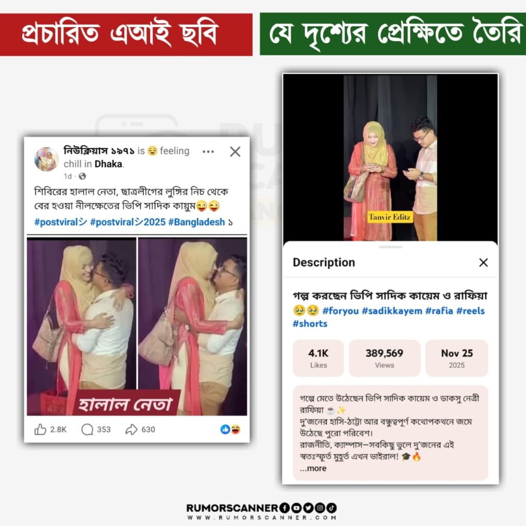 অনুসন্ধানে ‘Tanvir Editz’ নামের একটি ইউটিউব চ্যানেলে ‘গল্প করছেন ভিপি সাদিক কায়েম ও রাফিয়া’ শিরোনামে গত ২৫ নভেম্বরে প্রচারিত একটি ভিডিও পাওয়া যায়। ভিডিওটিতে প্রদর্শিত দৃশ্যের সাথে আলোচিত দাবিতে প্রচারিত ছবিতে প্রদর্শিত নারী ও সাদিক কায়েমের পোশাক, ব্যাগ, হিজাব ও গড়নের মিল পাওয়া যায়। তবে আলোচিত দাবিতে প্রচারিত ছবিতে ডাকসু সদস্য উম্মা উসওয়াতুন রাফিয়ার মুখমণ্ডল প্রায় পুরোপুরি পরিবর্তিত বা বিকৃত হয়ে গেছে যা অনেকসময় মূল ছবিতে কোনো সাবজেক্টের মুখ অস্পষ্ট থাকলে সেই ছবির প্রেক্ষিতে তৈরি এআই ছবিতে লক্ষ্য করা যায়।