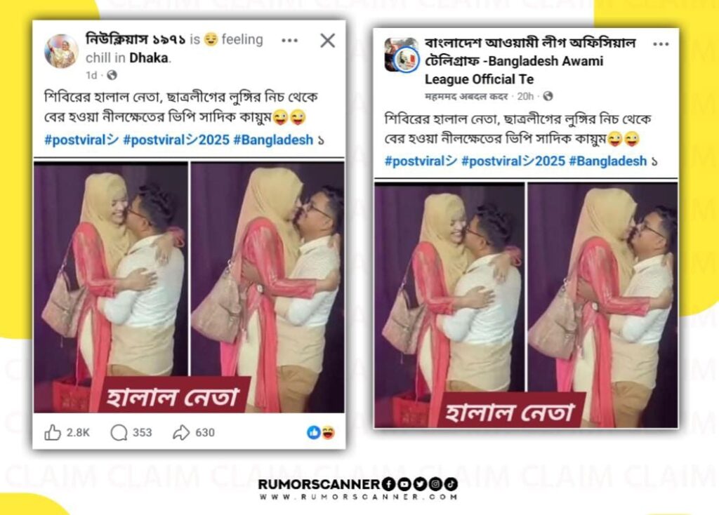 সম্প্রতি একজন নারীকে ঢাকা বিশ্ববিদ্যালয় কেন্দ্রীয় ছাত্রসংসদের (ডাকসু) ভিপি ও শাখা ছাত্রশিবিরের সভাপতি আবু সাদিক কায়েমের কোলে নেওয়ার ছবি দাবিতে দুইটি ছবির একটি কোলাজ ছবি সামাজিক যোগাযোগ মাধ্যমে প্রচার করা হয়েছে।