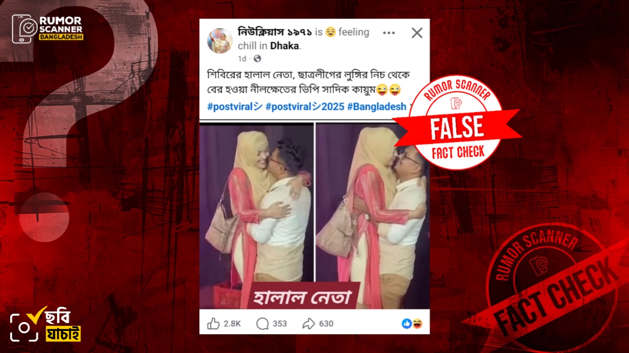 রিউমর স্ক্যানার টিমের অনুসন্ধানে জানা যায়, একজন নারীকে ডাকসু ভিপি আবু সাদিক কায়েমের কোলে নেওয়ার দৃশ্য দাবিতে প্রচারিত ছবি আসল নয়। প্রকৃতপক্ষে, কৃত্রিম বুদ্ধিমত্তা বা এআই প্রযুক্তির সহায়তায় সাদিক কায়েমের সাথে ডাকসু সদস্য উম্মা উসওয়াতুন রাফিয়ার কথা বলার একটি দৃশ্যের প্রেক্ষিতে উক্ত ছবি তৈরি করে অপপ্রচার চালানো হচ্ছে।