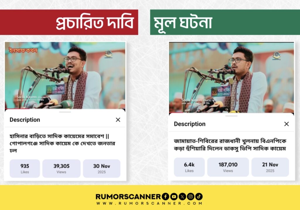 রিউমর স্ক্যানার টিমের অনুসন্ধানে জানা যায়, আলোচিত দাবিতে প্রচারিত ভিডিওটি গোপালগঞ্জের নয়। প্রকৃতপক্ষে, ২১ নভেম্বর খুলনা-৫ আসনের ডুমুরিয়া উপজেলার শাহপুর আন্দুলিয়া ফুটবল মাঠে ডুমুরিয়া উপজেলা জামায়াতে ইসলামীর উদ্যোগে আয়োজিত ছাত্র গণজমায়েতে সাদিক কায়েমের বক্তব্যের ভিডিওকে আলোচিত দাবিতে প্রচার করা হচ্ছে।