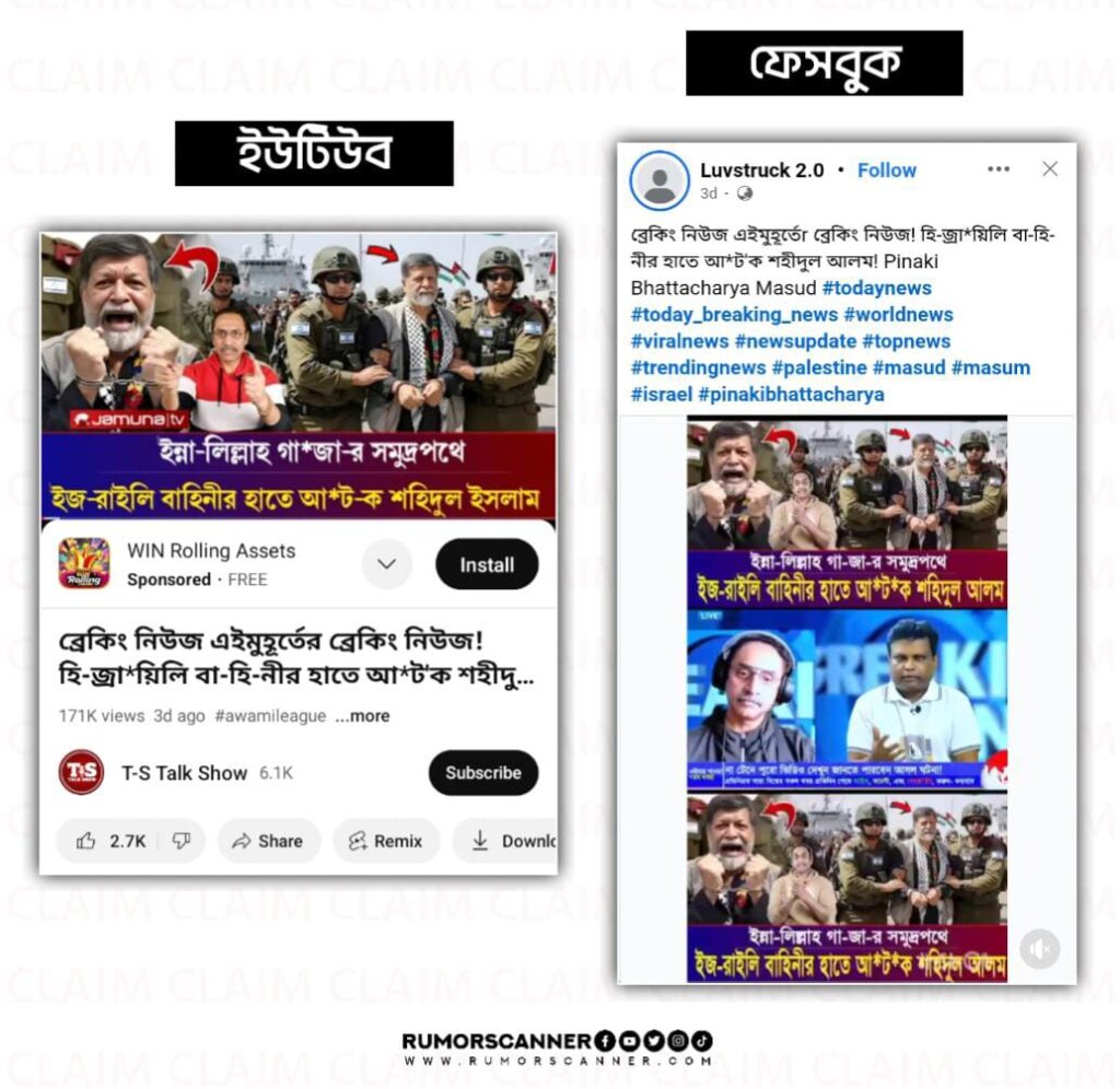 রিউমর স্ক্যানার টিমের অনুসন্ধানে জানা যায়, ইসরায়েলি বাহিনীর হাতে শহীদুল আলমের আটক অবস্থার ছবি দাবিতে প্রচারিত ছবিগুলো আসল নয়। প্রকৃতপক্ষে, কৃত্রিম বুদ্ধিমত্তা (এআই) প্রযুক্তির সাহায্যে এই ভুয়া ছবিটি তৈরি করা হয়েছে। এছাড়াও, শহিদুল আলমের ফেসবুক অ্যাকাউন্টেও স্বাভাবিকভাবেই নিয়মিত ‘কনশানস্’ জাহাজের বিষয়ে পোস্ট করা হচ্ছে। এই প্রতিবেদন প্রকাশ অবধি তার আটক হওয়ার কোনো তথ্য জানা যায়নি।
