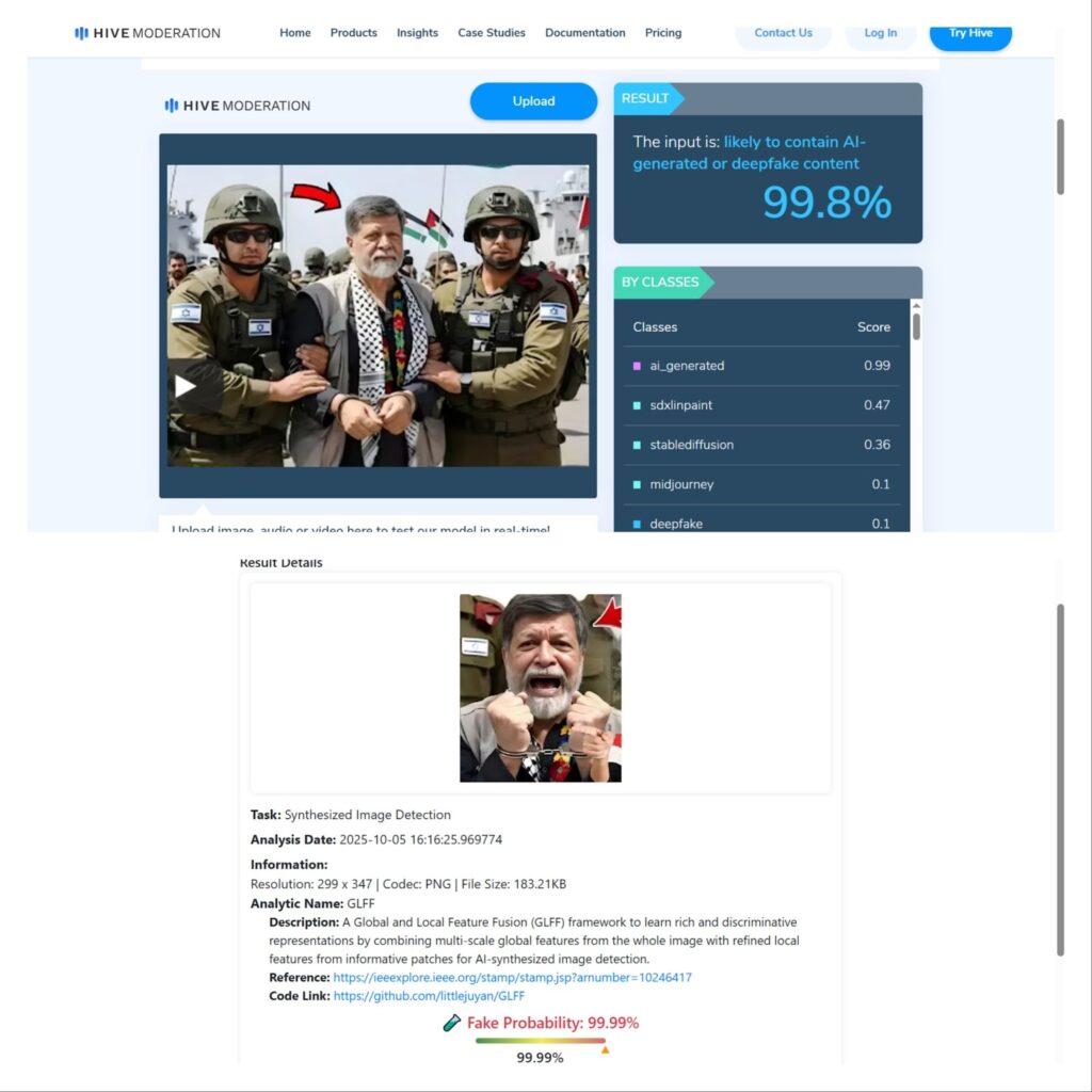প্রচারিত ছবিগুলোর বিষয়ে অধিকতর নিশ্চিত হতে এআই কনটেন্ট শনাক্তকারী প্ল্যাটফর্ম ‘হাইভ মডারেশন’ এ আলোচিত ছবিগুলো বিশ্লেষণ করলে ছবিগুলো এআই দিয়ে তৈরি কনটেন্ট হওয়ার সম্ভাবনা ৯৯.৮ ও ৯৬.৮ শতাংশ দেখা যায়। এছাড়াও এআই ও ডিপফেক কনটেন্ট শনাক্তকারী আরেক প্ল্যাটফর্ম ‘ডিপফেক ও মিটার’ এ আলোচিত ছবিগুলো বিশ্লেষণ করলে এটি ভুয়া হওয়ার সম্ভাবনা বেশি দেখা যায়। প্ল্যাটফর্মটির ‘HIFI’ ও ‘GLFF’ ডিটেক্টরের বিশ্লেষণমতে ছবিগুলো ভুয়া হওয়ার সম্ভাবনা যথাক্রমে ৯৯.২৭ ও ৯৯.৯৯ শতাংশ।