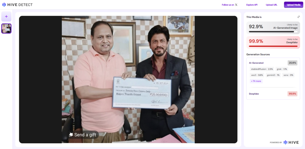 পরবর্তীতে আলোচিত দাবিতে প্রচারিত ছবিটি সূক্ষ্মভাবে পর্যালোচনা করে, শাহরুখ খানকে কোনো এক ব্যাংকের প্রতীকি চেক ধরে থাকতে দেখা যায়, যেখানে তারিখ হিসেবে ০৫ সেপ্টেম্বর, ২০২৪ এর উল্লেখ পাওয়া যায়। তাছাড়া, উক্ত চেকে একাধিক ভুল বানানের অস্তিত্বও লক্ষ্য করা যায়।
