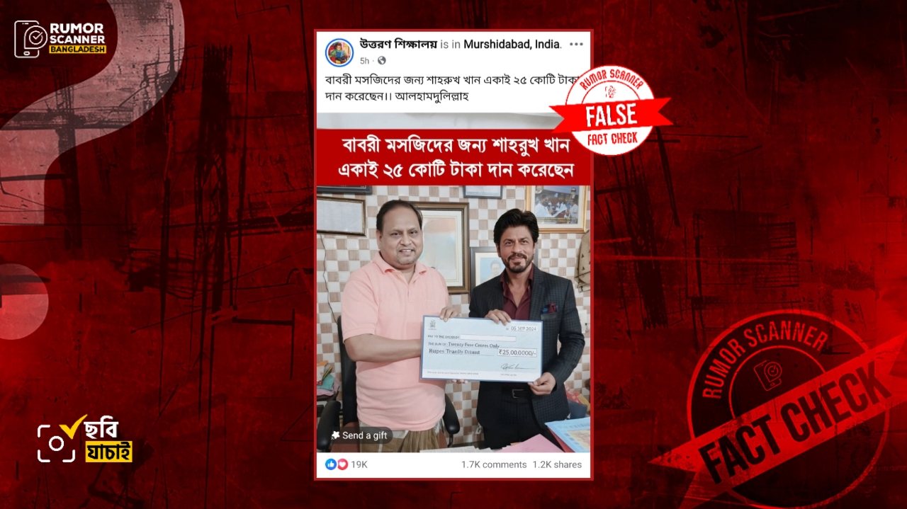 রিউমর স্ক্যানার টিমের অনুসন্ধানে দেখা যায়, মুর্শিদাবাদে বাবরি মসজিদ নির্মাণে বলিউড তারকা শাহরুখ খান ২৫ কোটি টাকা দান করেননি। উক্ত দাবিতে প্রচারিত ছবিটি আসল নয়। প্রকৃতপক্ষে, আলোচিত ছবিটি কৃত্রিম বুদ্ধিমত্তা (এআই) প্রযুক্তির সহায়তায় তৈরি করা হয়েছে।