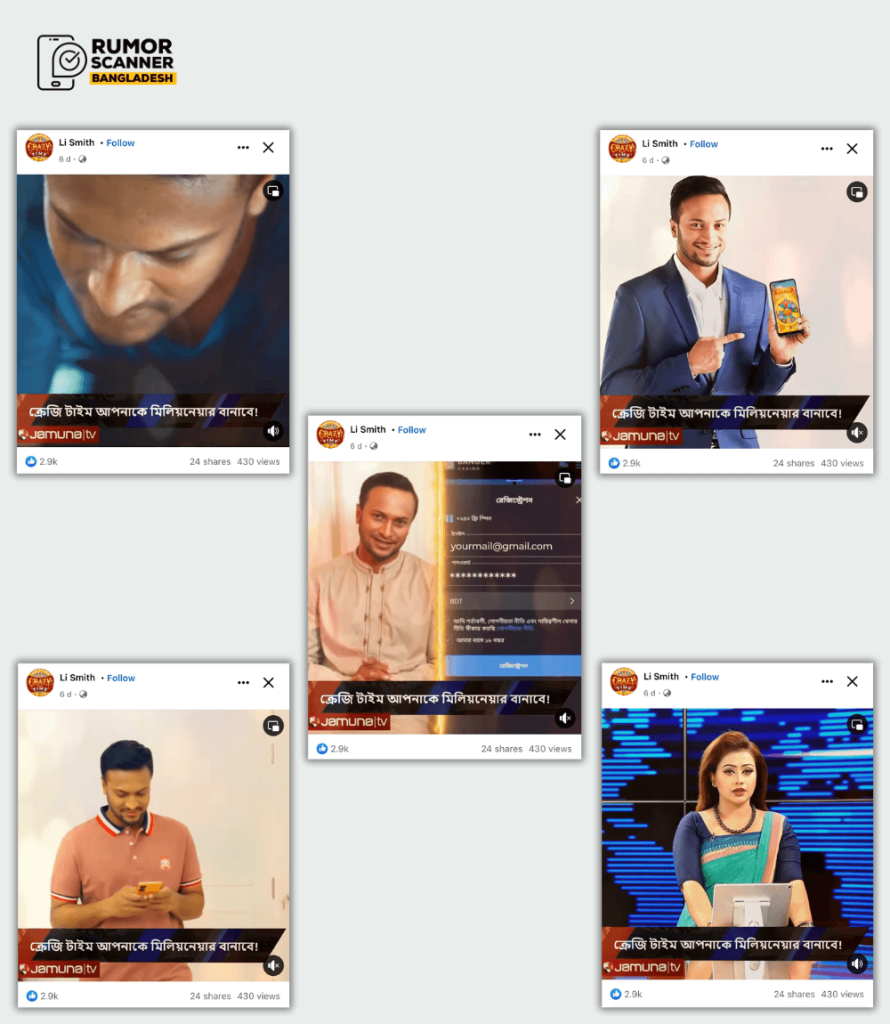 মূলত, সম্প্রতি ফেসবুকে Li Smith নামে একটি পেজ থেকে Crazy Times নামে একটি অ্যাপের প্রচারণায় বাংলাদেশের ক্রিকেটার সাকিব আল হাসান অংশ নিয়েছেন শীর্ষক দাবিতে বেসরকারি ইলেকট্রনিক সংবাদমাধ্যম যমুনা টেলিভিশনের লোগো সম্বলিত একটি ভিডিও প্রচার করা হয়। তবে রিউমর স্ক্যানার টিমের অনুসন্ধানে জানা যায়, উক্ত দাবিটি সঠিক নয়। প্রকৃতপক্ষে, আরটিভির সংবাদ পাঠিকার ভিডিও, সাকিব আল হাসানের পুরোনো ও ভিন্ন কোম্পানির বিজ্ঞাপনের ফুটেজ এবং এআই দিয়ে তৈরি অডিও ও যমুনা টিভির লোগো ব্যবহার করে প্রতারণার উদ্দেশ্যে ভুয়া এই দাবি প্রচার করা হয়েছে।