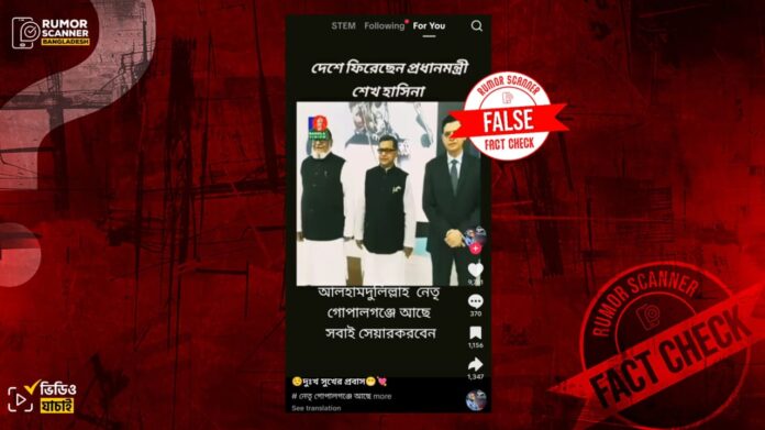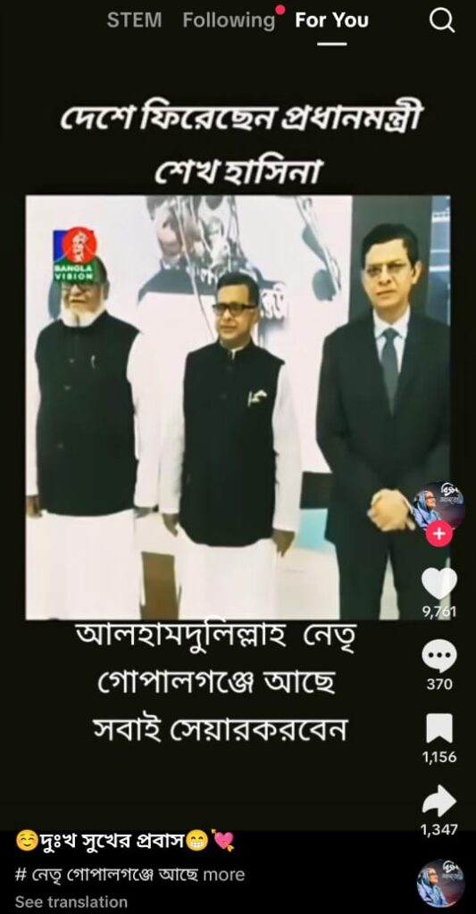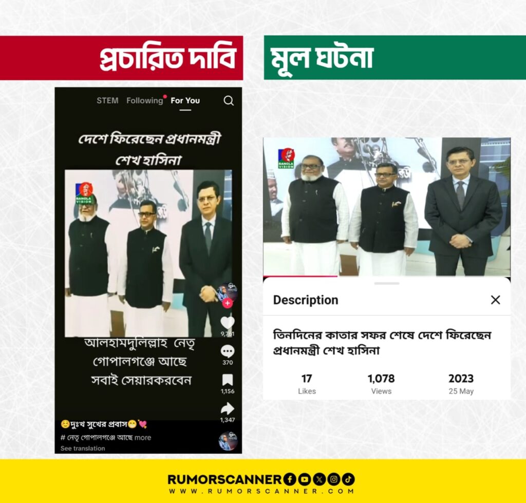 সম্প্রতি, “দেশে ফিরেছেন প্রধানমন্ত্রী শেখ হাসিনা আলহামদুলিল্লাহ নেতৃ গোপালগঞ্জে আছে সবাই সেয়ারকরবেন” শীর্ষক ক্যাপশনে একটি ভিডিও সামাজিক যোগাযোগ মাধ্যমে প্রচার করা হয়েছে।