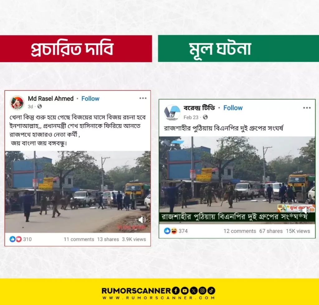 রিউমর স্ক্যানার টিমের অনুসন্ধানে জানা যায়, প্রচারিত ভিডিওটি সাম্প্রতিক সময়ের নয় এবং এর সাথে শেখ হাসিনার দেশে ফেরা কিংবা আওয়ামী লীগের অবস্থান কর্মসূচির কোনো সম্পর্ক নেই। প্রকৃতপক্ষে, গত ফেব্রুয়ারিতে রাজশাহীতে টিসিবির কার্ডকে কেন্দ্র করে বিএনপির ২ গ্রুপের মধ্যকার সংঘর্ষের ভিডিওকে উক্ত দাবিতে প্রচার করা হয়েছে।